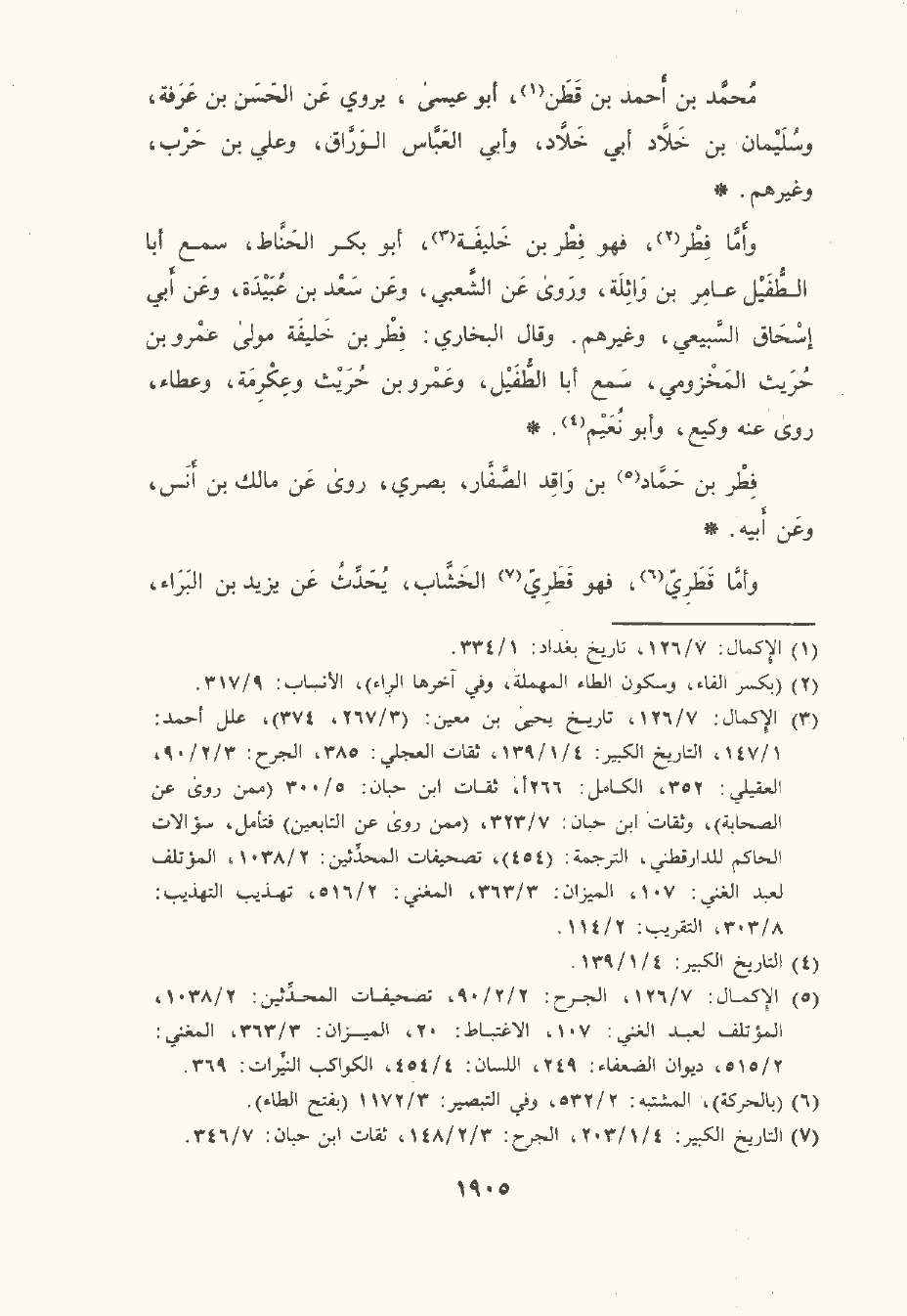 وأمَّا فِطْر , فهو فِطْر بن خليفة أبو بَكْر الحناط , سَمِعَ أبا الطُّفَيْل عَامِر بن واثلة , ورَوَى عن الشَّعْبيّ , وعن سَعْد بن عُبَيْدَة , وعن أبي إِسْحَاق السَّبِيعِيّ , وغَيْرهم. وقال البُخَاريُّ: فطر بن خليفة مولى عَمْرو بن حريث المَخْزُومِي , سَمِعَ أبا الطُّفَيْل , وعَمْرو بن حريث , وعِكْرِمَة وعَطَاء , رَوَى عَنْه وَكِيع , وأبو نُعَيْم.