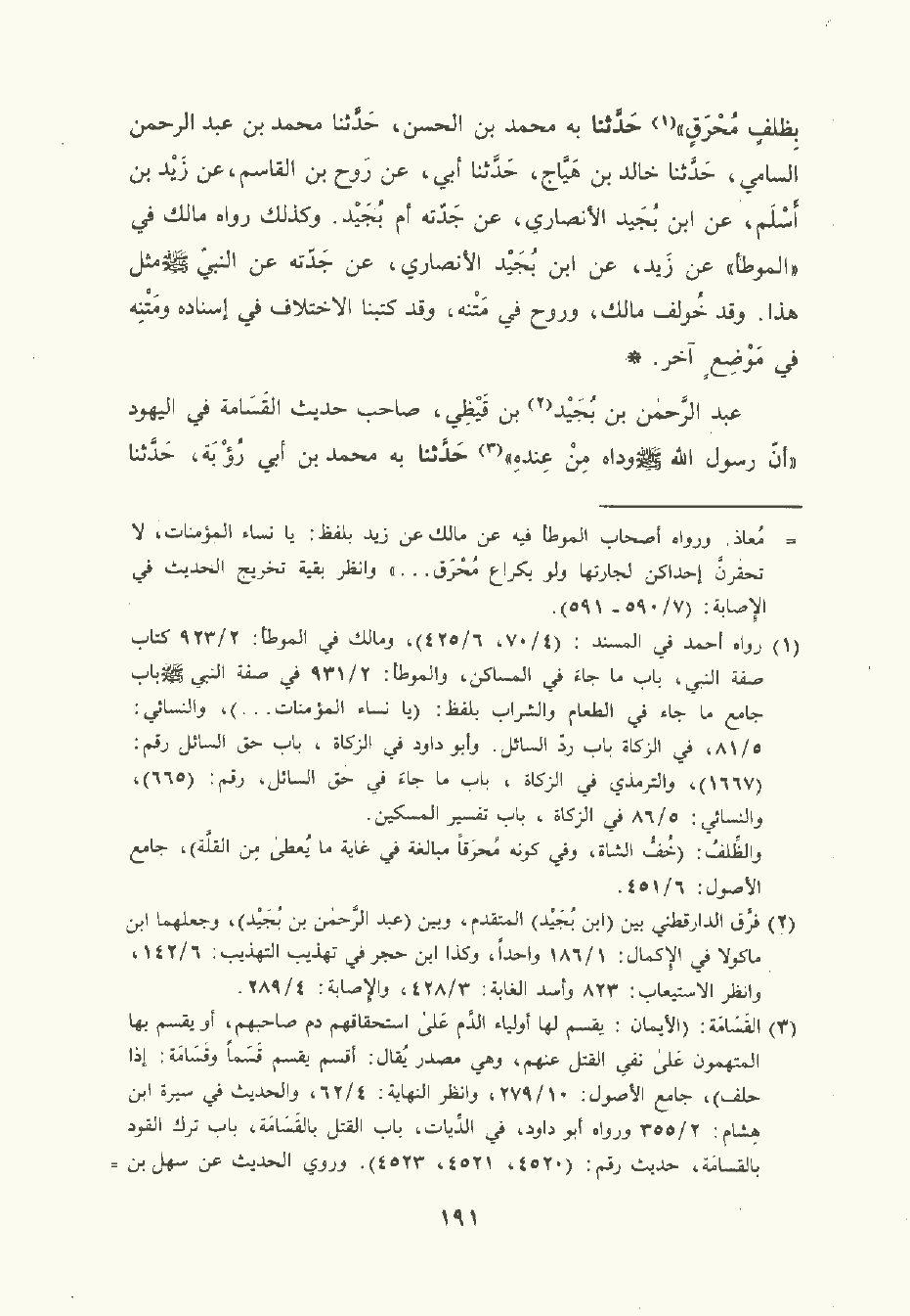 , حَدَّثَنا به مُحمَّد بن الحسن , حَدَّثَنا مُحمَّد بن عبد الرَّحْمن السَّامي , حَدَّثَنا خالد بن هَيَّاج , حَدَّثَنا أبي , عن رَوْح بن القَاسِم , عن زَيْد بن أَسْلم , عن ابن بُجَيْد الأَنْصَاري , عن جدته أم بُجَيْد. وكذلك رواه مالك في الموطأ , عن زيد , عن ابن بُجَيْد الأَنْصَاري , عن جدته , عن النَّبِيّ صلى الله عليه وسلم مثل هذا. وقد خولف مالك وروح في متنه وقد كتبنا الاختلاف في إسناده ومتنه في موضع آخر.