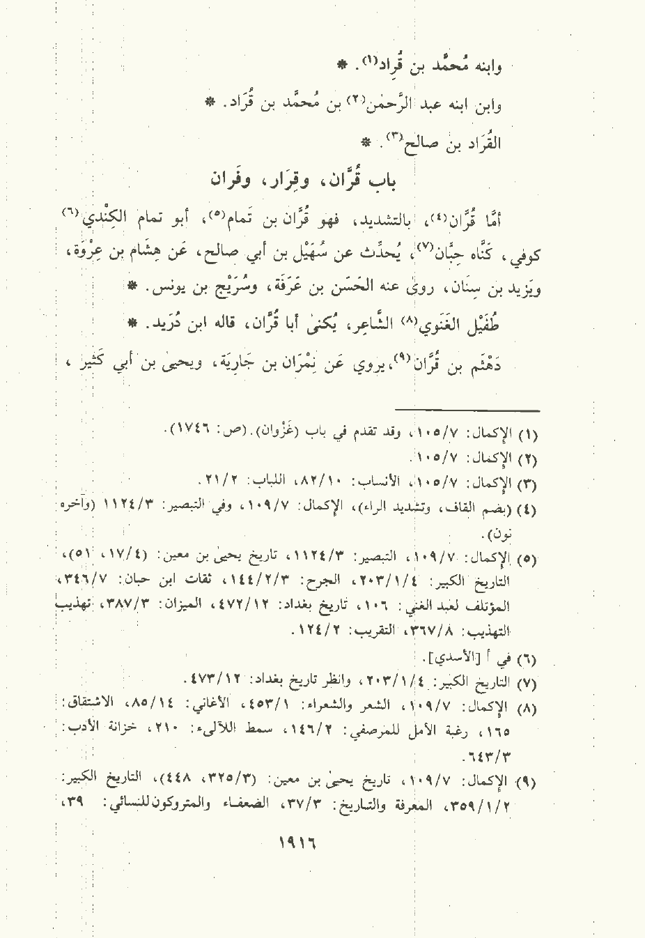 أمّا قُرَّان , بالتشديد , فهو قُرَّان بن تمام أبو تمام الكِنْدي كُوفِيّ كناه حبان , يُحَدِّث عن سُهَيْل بن أبي صَالِح , عن هِشَام بن عُرْوَة ويزيد بن سنان , رَوَى عَنْه الحَسَن بن عرفة وسريج بن يُونُس.
