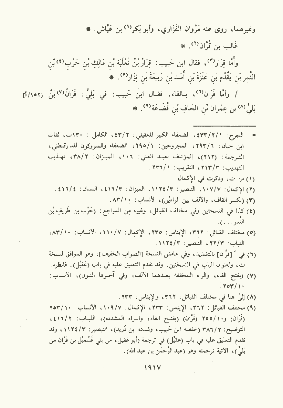 وأمَّا فَران , بالفاء فقال ابن حَبِيب: في بلي: فَران بن بلي بن عِمْرَان بن الحاف بن قُضَاعة.