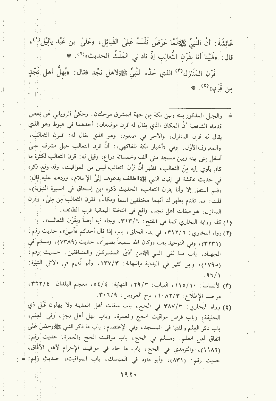 عن عائشة: أنّ النَّبِيّ صلى الله عليه وسلم لما عرض نفسه على القبائل , وعلى ابن عبد ياليل، قال: " فبينا أنا بقرن الثعالب إذ ناداني الملك الحديث ".
