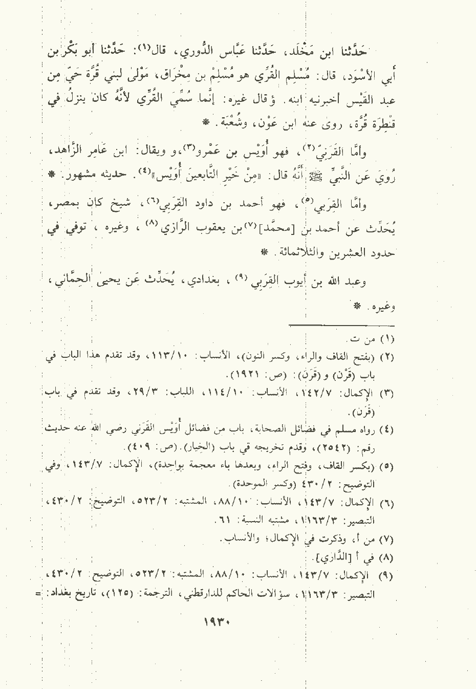وأمَّا القَرَنِي , فهو أُوَيْس بن عَمْرو , ويقال: ابن عَامِر الزَّاهِد , رَوَى عن النَّبِيِّ صلى الله عليه وسلم أنه قال: " من خير التابعين أُوَيْس ". حديثه مشهور.