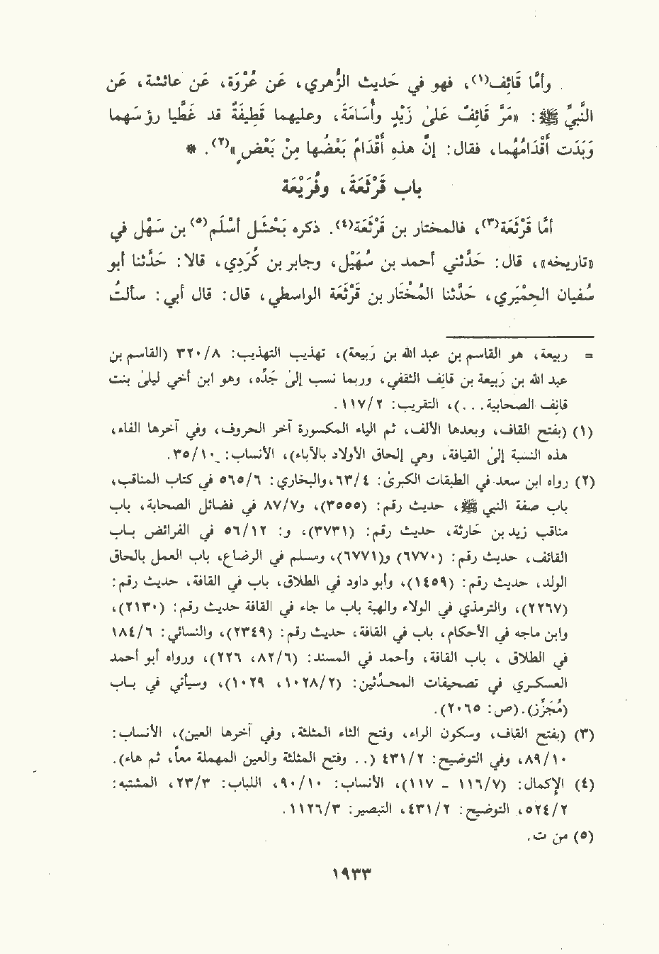 وأمَّا قَائِف , فهو في حديث الزُّهْريّ , عن عُرْوَة , عن عائشة , عن النَّبِيِّ صلى الله عليه وسلم: " مر قَائِف على زَيْد وأسامة وعليهما قطيفة قد غطيا رؤسهما وبدت أقدامهما فقال: إن هذه أقدام بعضها من بعض ".