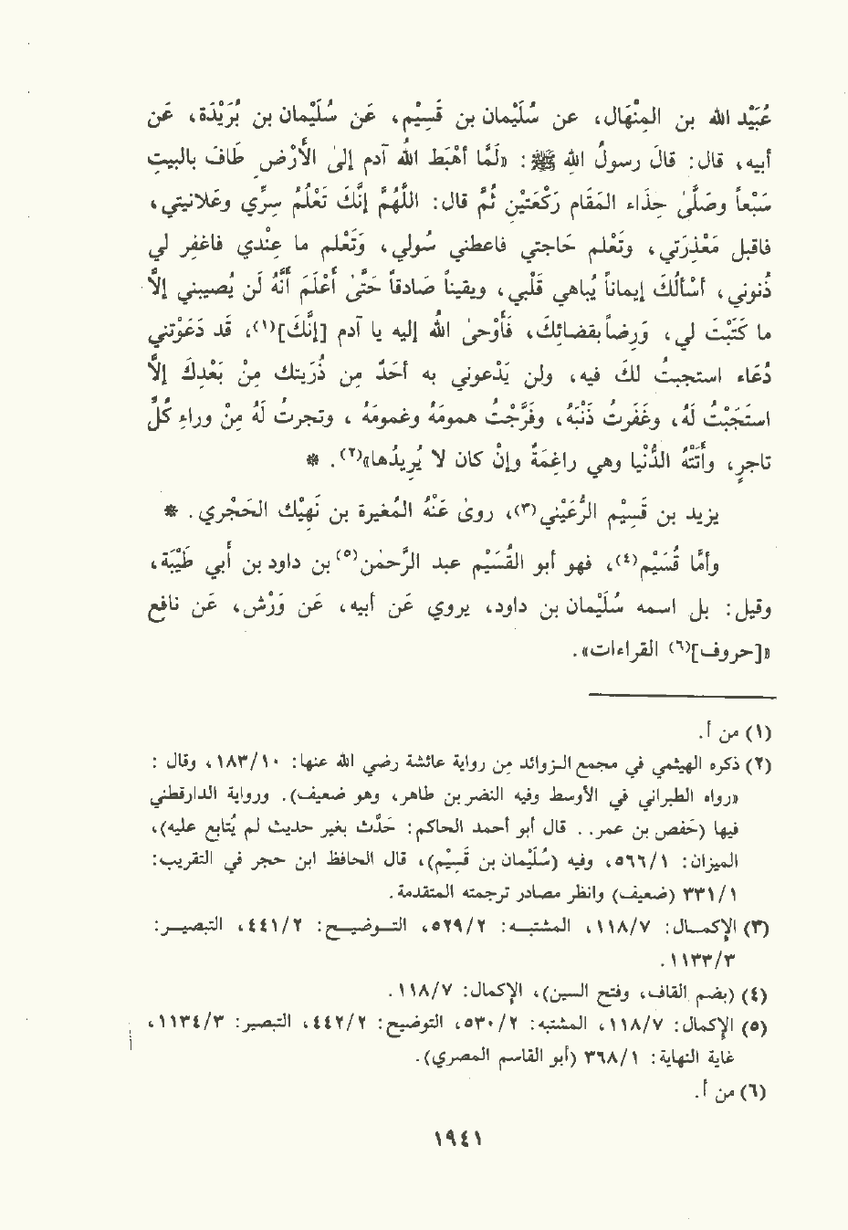 عن سُلَيْمان بن قسيم , عن سُلَيْمان بن بريدة , عن أبيه , قال: قال رسول الله صلى الله عليه وسلم: " لما أهبط الله آدم إلى الأَرْض , طاف بالبيت سبعا , وصلى حذاء المقام ركعتين , ثم قال: اللهم إنك تعلم سري وعلانيتي فاقبل معذرتي وتعلم حاجتي فاعطني سولي وتعلم ما عندي فاغفر لي ذنوبي أسألك إيمانا يباهي قلبي ويقينا صادقا حتى أعلم أنه لن يصيبني إلا ما كتبت لي ورضا بقضائك فأوحى الله إليه يا آدم إنك قد دعوتني دعاء استجيب لك فيه ولن يدعوني به أحد من ذريتك من بعدك إلا استجبت له وغفرت ذنبه وفرجت همومه وغمومه وتجرت له من وراء كل تاجر وأتته الدنيا وهي راغمة وإن كان لا يريدها ".