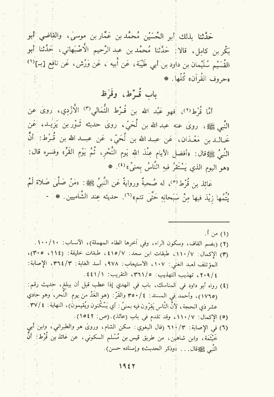 أمّا قُرْط , فهو عَبد الله بن قُرْط الثمالي الأَزْدِيّ , رَوَى عن النَّبِيِّ صلى الله عليه وسلم , رَوَى عَنْه عَبد الله بن لحي , رَوَى حَدِيثه ثَوْر بن يَزِيد , عن خالد بن معدان , عن عَبد الله بن لحي , عن عَبد الله بن قُرْط: أنّ النَّبِيّ صلى الله عليه وسلم , قال: " أفضل الأيام عند الله يوم النحر , ثم يوم القر " وفسره , قال: " هو اليوم الذي يستقر فيه النَّاس بمنى ".