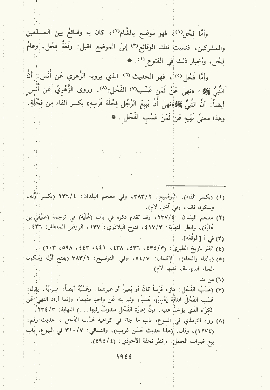 وأمَّا فَحْل , فهو الحديث الذي يرويه الزُّهْريّ , عن أنس: أنّ النَّبِيّ صلى الله عليه وسلم: " نهى عن ثمن عسب الفحل " وروى الزُّهْريّ , عن أنس أيضًا: أنّ النَّبِيّ صلى الله عليه وسلم: " نهى أن يبيع الرجل فِحْلَة فرسه " بكسر الفاء من فحلة.