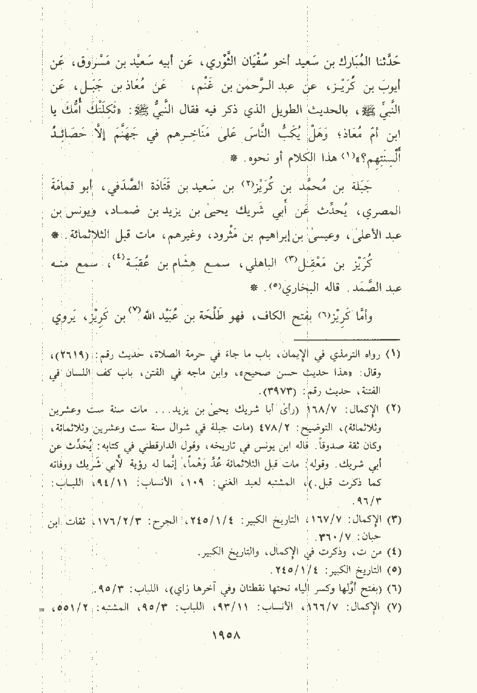 وأمَّا كَرِيز بفتح الكاف , فهو طَلْحَة بن عُبَيْد الله بن كَرِيز , يَرْوي عن ابن عُمَر , رَوَى عَنْه حُمَيْد الطويل وحَمَّاد بن سَلَمة.