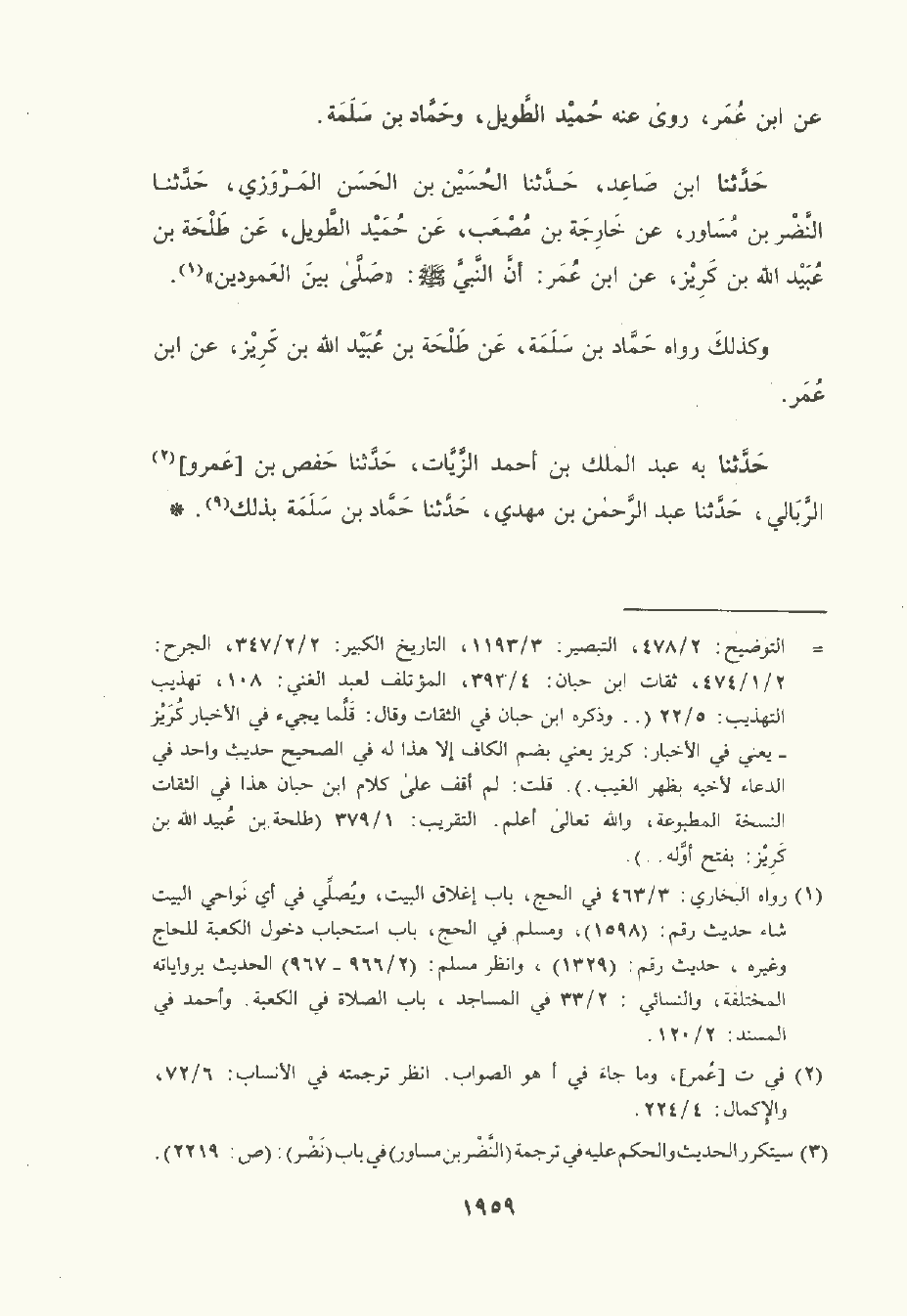 حَدَّثَنا ابن صَاعِد , حَدَّثَنا الحُسَين بن الحَسَن المَرْوَزِيّ , حَدَّثَنا النَّضْر بن مساور , عن خارجة بن مُصْعَب , عن حُمَيْد الطويل , عن طَلْحَة بن عُبَيْد الله بن كَرِيز , عن ابن عُمَر: أنّ النَّبِيّ صلى الله عليه وسلم: " صلى بين العمودين ".