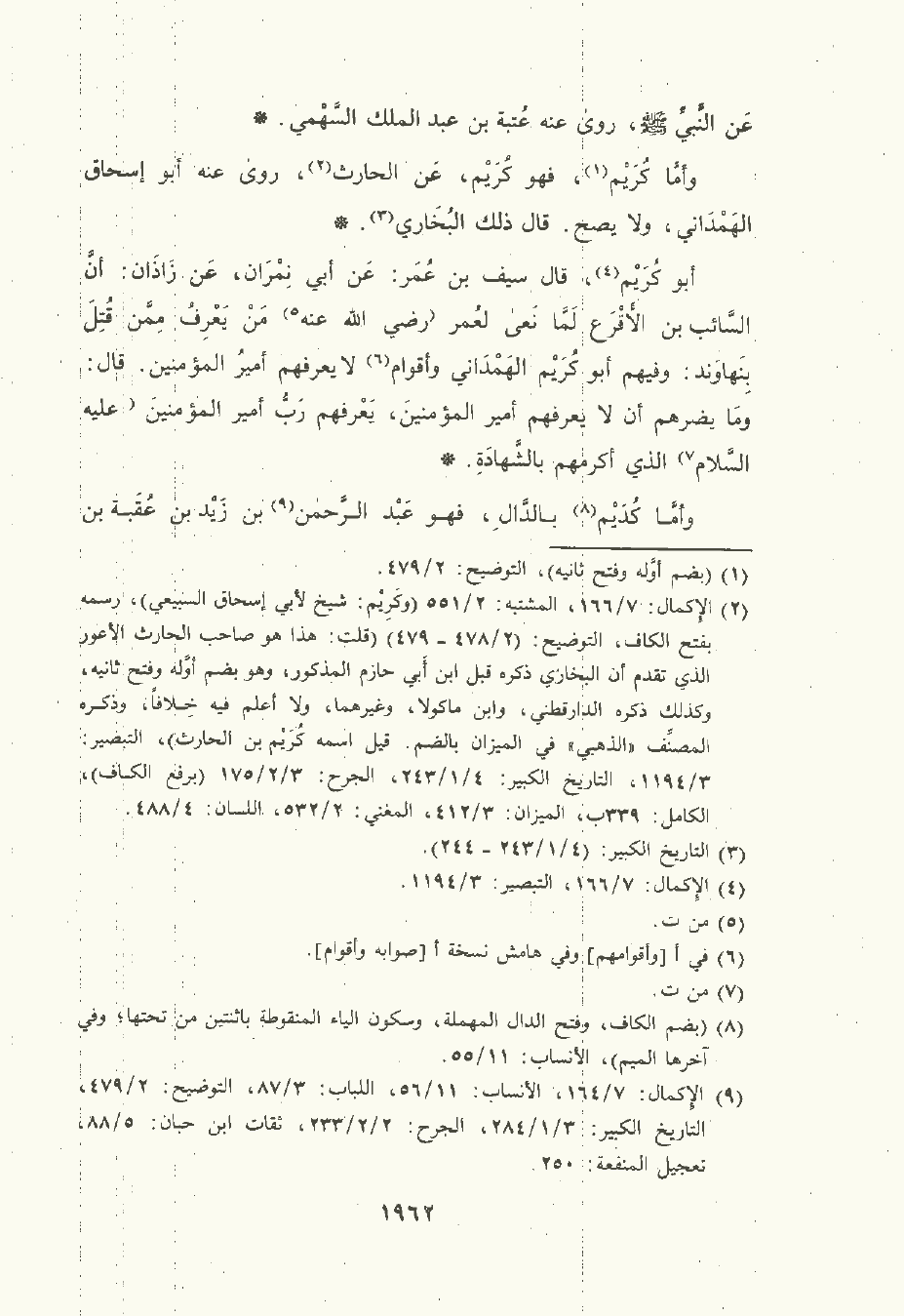 أبو كُرَيْم , قال سيف بن عُمَر: عن أبي نمران , عن زاذان: أنّ السَّائب بن الأقرع لما نعى لعمر رضي الله عنه من يَعْرِف ممن قتل ينهاوند: وفيهم أبو كريم الهَمْدَانيّ وأقوام لا يعرفهم أمير المؤمنين. قال: وما يضرهم أن لا يعرفهم أمير المؤمنين يعرفهم رب أمير المؤمنين عليه السَّلام الذي أكرمهم بالشهادة.