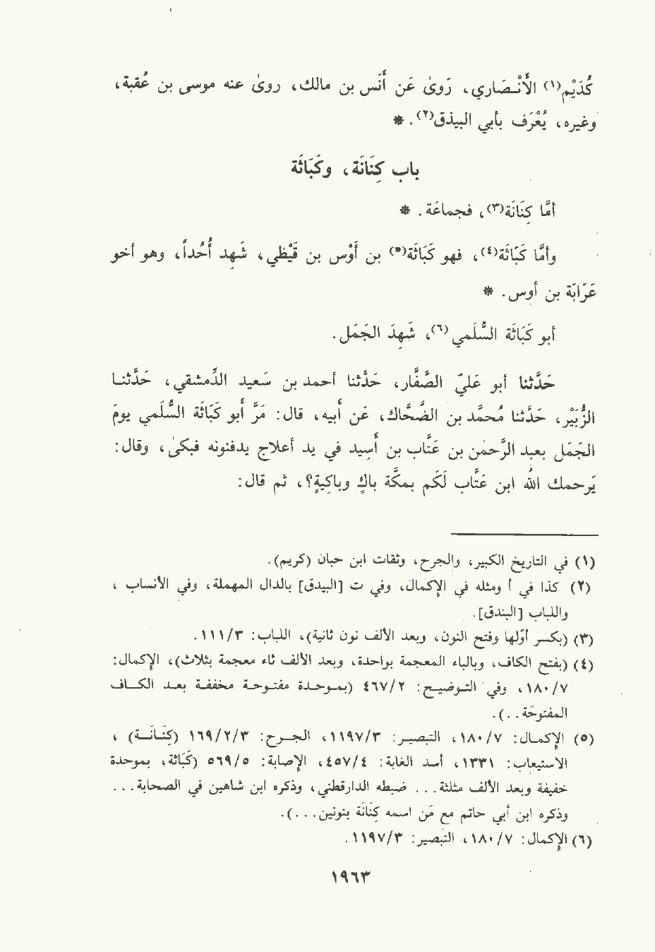 حَدَّثَنا أبو عَلِيّ الصَّفَّار , حَدَّثَنا أحمد بن سَعِيد الدِّمَشْقيّ , حَدَّثَنا الزُّبَيْر , حَدَّثَنا مُحمَّد بن الضَّحَّاك , عن أبيه , قال: مر أبو كباثة السُّلَمِيّ يوم الجمل بعَبْد الرَّحْمن بن عَتَّاب بن أَسِيد في يد أعلاج يدفنونه فبكى وقال: يرحمك الله ابن عَتَّاب لكم بمكة باك وباكية؟ ثم قال: