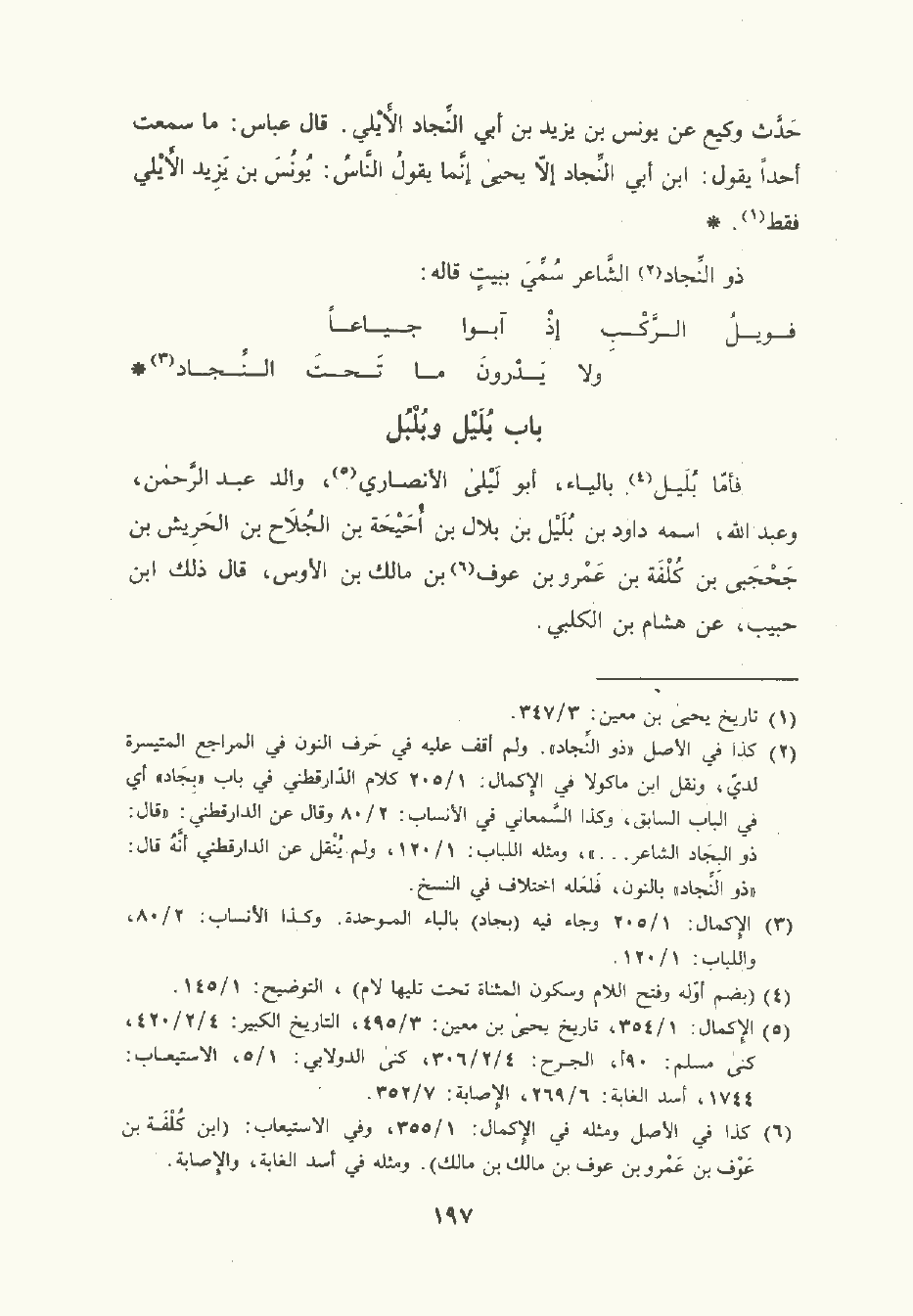 فأما بُلَيْل بالياء أبو ليلى الأَنْصَاري والد عبد الرَّحْمن وعبد الله اسمه داود بن بُلَيْل بن بلال بن أُحَيْحَة بن الجُلاَح بن الحَرِيش بن جَحْجَبي بن كُلْفَة بن عَمْرو بن عَوْف بن مالك بن الأوس قال ذلك ابن حبيب , عن هشام بن الكَلْبي.
