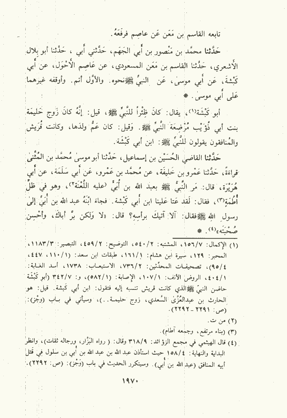 حَدَّثَنا القاضي الحُسَين بن إِسْمَاعِيل , حَدَّثَنا أبو موسى مُحمَّد بن المُثَنَّى قراءة , حَدَّثَنا عَمْرو بن خليفة , عن مُحمَّد بن عَمْرو , عن أبي سَلَمَة , عن أبي هُرَيْرة , قال: مر النَّبِيّ صلى الله عليه وسلم بعَبد الله بن أُبَي , عليه اللعنة , وهو في ظل أطمة فقال: لقد عتا علينا ابن أبي كبشة. فجاء ابنه عَبد الله بن أُبَي إلى رسول الله صلى الله عليه وسلم فقال: آلا آتيك برأسه؟ قال: " لا ولكن بر أباك وأحسن صحبته ".