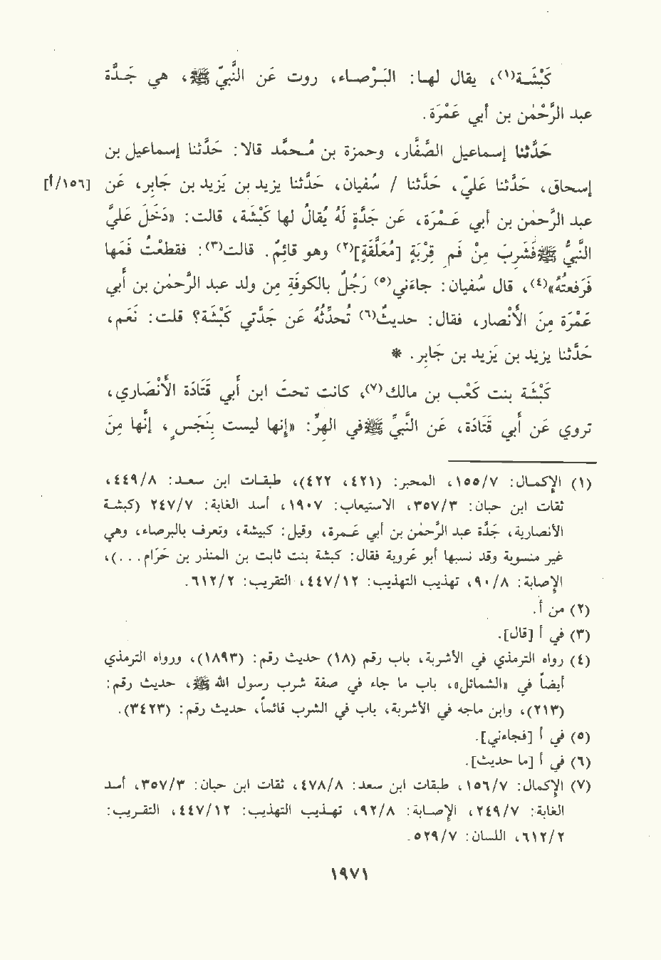 حَدَّثَنا إِسْمَاعِيل الصَّفار , وحَمْزَة بن مُحمَّد , قَالا: حَدَّثَنا إِسْمَاعِيل بن إِسْحَاق , حَدَّثَنا علي , حَدَّثَنا سُفْيان , حَدَّثَنا يَزِيد بن يَزِيد بن جَابِر , عن عَبْد الرَّحْمن بن أبي عُمَرة , عن جدة له يقال لها كبشة قالت: " دخل علي النَّبِيّ صلى الله عليه وسلم فشرب من فم قربة معلقة , وهو قائم. قالت: فقطعت فمها فرفعته " قال سُفْيان: جاءني رجل بالكوفة من ولد عَبْد الرَّحْمن بن أبي عُمَرة من الأَنْصَار فقال: حديث تحدثه , عن جدتي كبشة؟ قلت: نعم , حَدَّثَنا يَزِيد بن يَزِيد بن جَابِر.