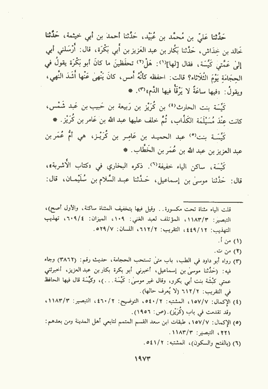 حَدَّثَنا عَلِيّ بن مُحمَّد بن عُبَيْد , حَدَّثَنا أحمد بن أبي خَيْثَمة , حَدَّثَنا خالد بن خداش , حَدَّثَنا بَكَّار بن عَبْد العَزِيز بن أبي بكرة , قال: أرسلني أبي إلى عمتي كَيِّسَة فقال لها: هل تحفظين ما كان أبو بكرة يقول في الحجامة يوم الثلاثاء؟ قالت: أحفظه كأنه أمس , كان ينهى عنها أشد النهي ويقول: " فيها ساعة لا يرفأ فيها الدم ".