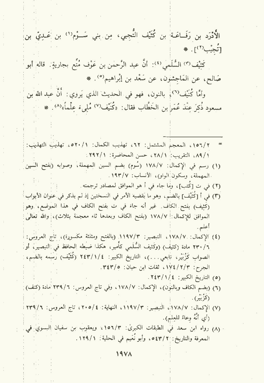 وأمَّا كُنَيْف , بالنون , فهو في الحديث الذي يَرْوي: أن عَبد الله بن مَسْعود ذكر عند عُمَر بن الخَطَّاب فقال: " كُنَيْف ملىء علما ".