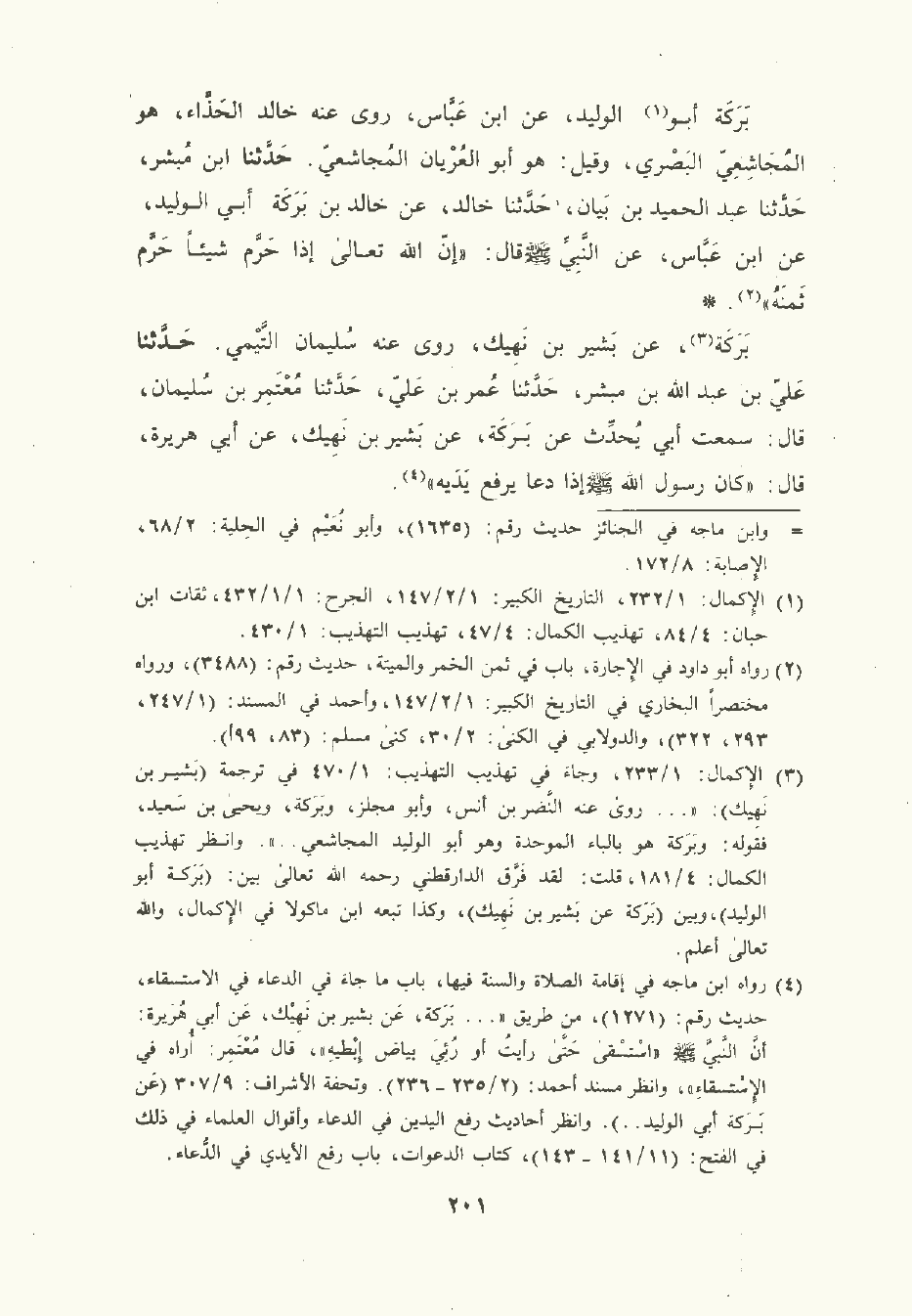بَرَكة أبو الوليد , عن ابن عَبَّاس، رَوَى عنه خالد الحذاء هو المُجَاشعي البَصْري وقيل: هو أبو العريان المُجَاشعي. حَدَّثَنا ابن مُبشر , حَدَّثَنا عبد الحميد بن بَيَان , حَدَّثَنا خالد , عن خالد بن بَرَكَة أبي الوليد , عن ابن عَبَّاس , عن النَّبِيّ صلى الله عليه وسلم قال: إن الله تعالى إذا حرم شيئا حرم ثمنه.