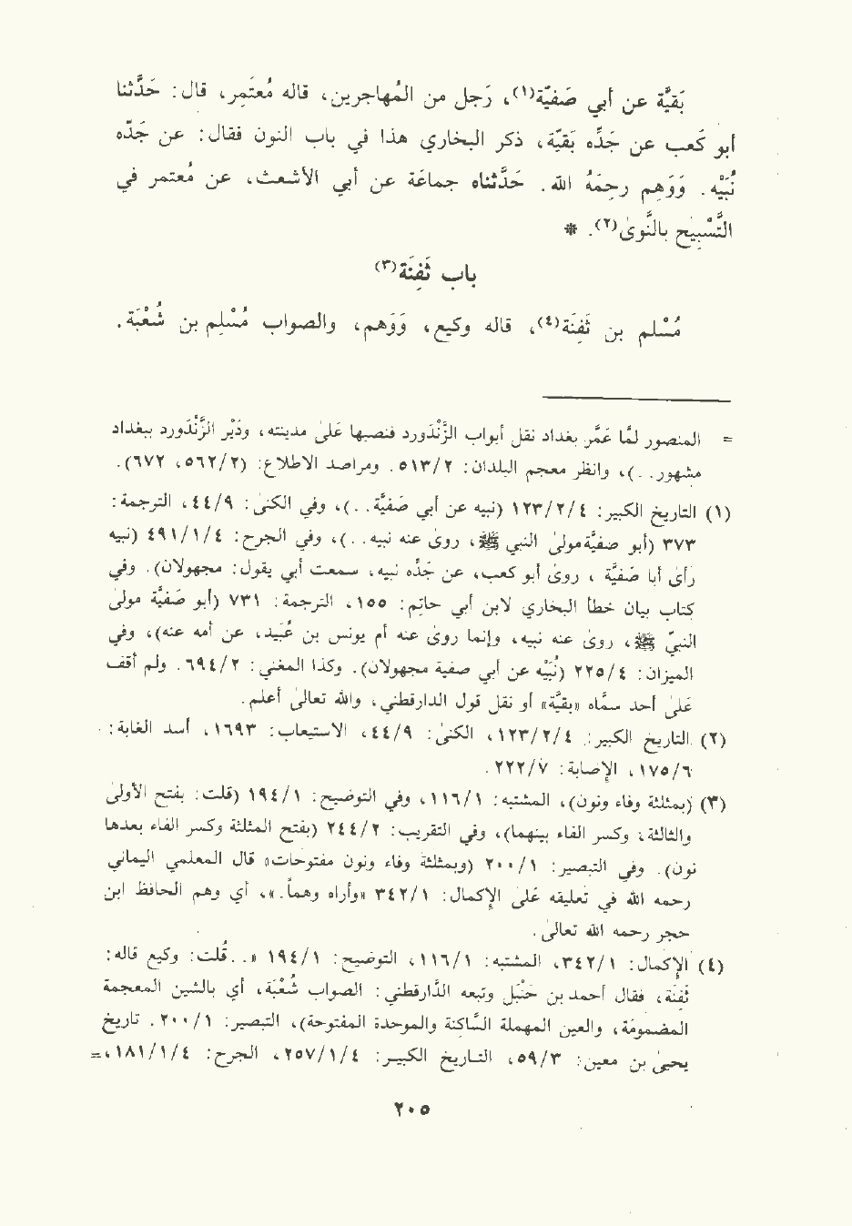 بَقِيَّة , عَن أبي صَفِيَّة رجل من المُهَاجرين قاله مُعْتَمِر قال: حَدَّثَنا أبو كَعْب , عن جده بَقِيَّة , ذكر البُخَاري هذا في باب النون فقال: عن جده نُبَيْه. ووَهِم رحمه الله. حدثناه جماعة , عَن أبي الأشعث , عن مُعْتَمِر في التسبيح بالنوى.