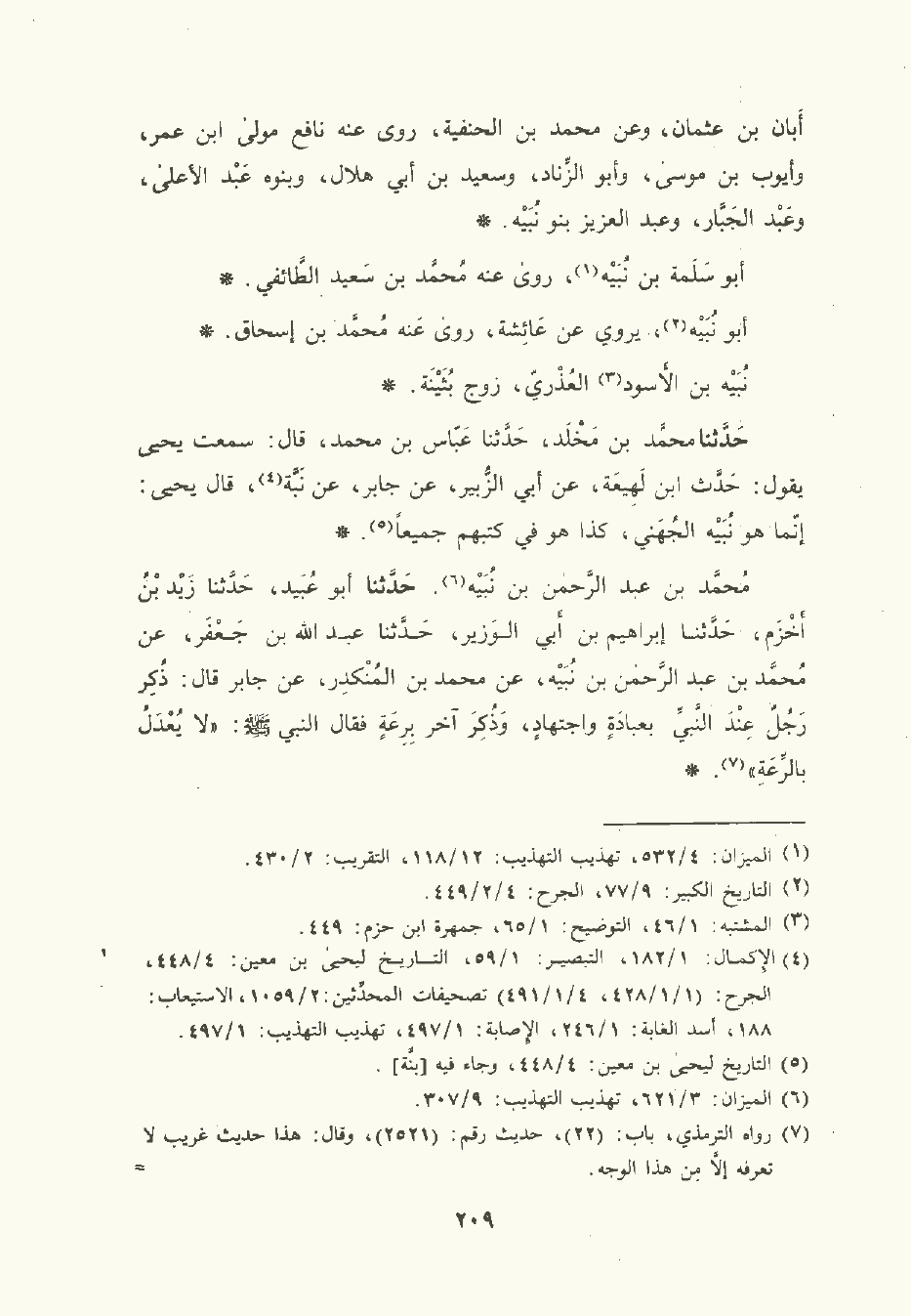 مُحمَّد بن عبد الرَّحْمن بن نُبَيْه , حَدَّثَنا أبو عبيد , حَدَّثَنا زَيْد بن أخزم , حَدَّثَنا إبراهيم بن أبي الوزير , حَدَّثَنا عَبد الله بن جَعْفَر , عن مُحمَّد بن عبد الرَّحْمن بن نُبَيْه , عن مُحمَّد بن المنكدر , عن جابر قال: ذكر رجل عند النَّبِيّ صلى الله عليه وسلم بعبادة واجتهاد , وذكر آخر بِرَعَةٍ فقال النَّبِيّ صلى الله عليه وسلم: لا يعدل بالرِّعَةِ.