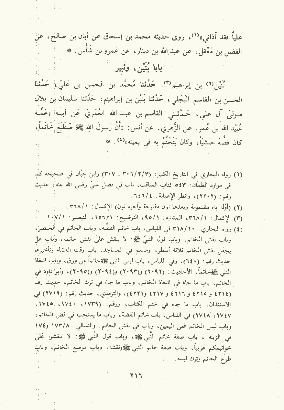 بُنَيْن بن إبراهيم , حَدَّثَنا مُحمَّد بن الحسن بن علي , حَدَّثَنا الحسن بن القَاسِم البَجَلِي , حَدَّثَنا بُنَيْن بن إبراهيم , حَدَّثَنا سُلَيمان بن بلال مولى آل علي حَدَّثني القَاسِم بن عبد الله العُمَريّ , عَن أبيه وعمه عُبَيد الله بن عُمَر , عن الزُّهْري , عن أنس: أن رسول الله صلى الله عليه وسلم اصطنع خاتما كان فصه حبشيا وكان يتختم به في يمينه.