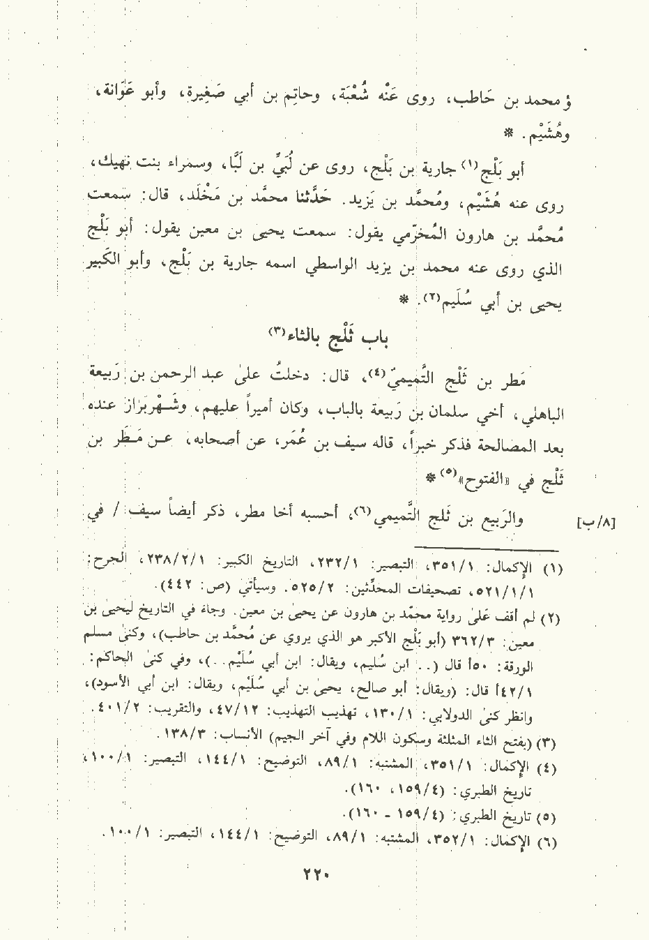 أبو بَلْج جارية بن بَلْج رَوَى عن لُبَيِّ بن لَبَّا وسمراء بنت نهيك، رَوَى عنه هُشَيْم ومحمد بن يَزيد. حَدَّثَنا مُحمَّد بن مَخْلَد، قال: سَمِعتُ مُحمَّد بن هارون المُخَرِّمي يقول: سَمِعتُ يَحْيى بن مَعِين يقول: أبو بَلْج الَّذي، رَوَى عنه مُحمَّد بن يَزِيد الوَاسِطيّ اسمه جارية بن بَلْج وأبو الكبير يحيى بن أبي سُلَيم.