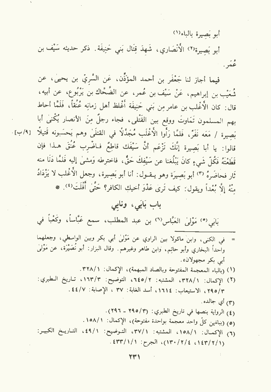 فيما أجاز لنا جَعْفَر بن أحمد المُؤَذِّن , عن السَّرِيّ بن يَحْيى , عن شُعَيْب بن إبراهيم , عن سَيْف بن عُمَر , عن الضَّحاك بن يَرْبُوع , عَن أبيه قال: كان الأَغْلب بن عامر من بني حَنِيفَة أغلظ أهل زمانه عُنُقًا فلما أحاط بهم المسلمون تماوت ووقع بين القتلى فجاء رجل من الأَنْصَار يُكْنَى أبا بصيرة معه نفر , فلما رأوا الأغلب مجدلا في القتلى , وهم يحسبونه قتيلا قالوا: يا أبا بصيرة إنك تزعم أن سيفك قاطع فاضرب عنق هذا فإن قطعته فكل شيء كان يبلغنا عن سيفك حق , فاخترطه ومشى إليه فلما دنا منه ثار فحاضره أبو بصيرة وهو يقول: أنا أبو بصيرة , وجعل الأغلب لا يزداد منه إلا بعدا , ويقول: كيف ترى عدو أخيك الكافر؟ حتى أفلت.