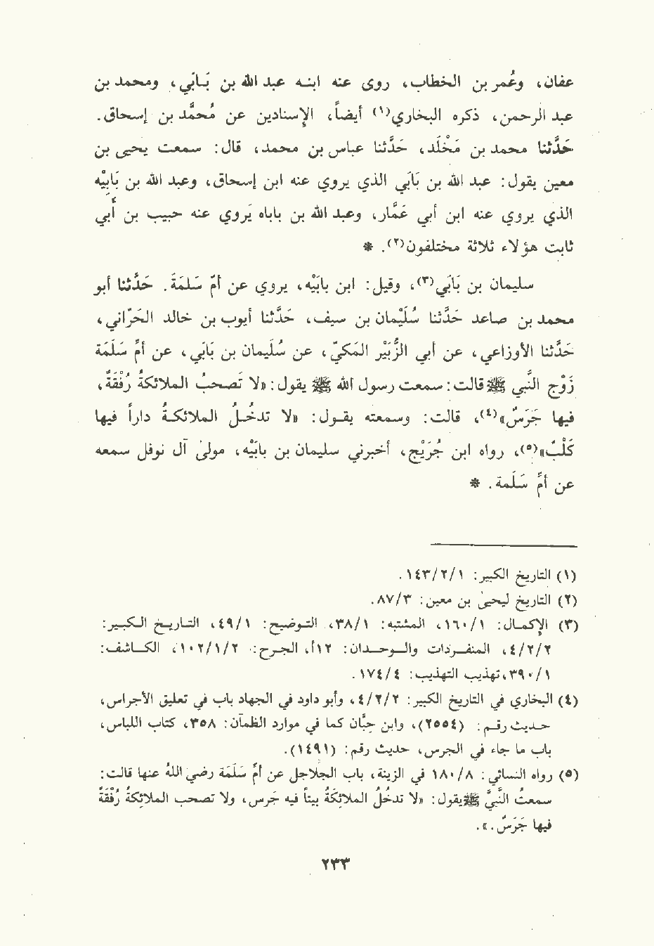 سُلَيمان بن بَابَي وقيل: ابن بَابَيْه يَرْوِي عن أم سَلَمَة. حَدَّثَنا أبو مُحمَّد بن صَاعِد , حَدَّثَنا سُلَيمان بن سَيْف , حَدَّثَنا أَيُّوب بن خالد الحراني , حَدَّثَنا الأَوْزَاعي , عَن أبي الزُّبَيْر المَكِّي , عن سُلَيمان بن بَابَي , عن أم سَلَمَة زوج النَّبِيّ صلى الله عليه وسلم قالت: سَمِعتُ رسول الله صلى الله عليه وسلم يقول: لا تصحب الملائكة رفقة فيها جرس قالت: وسمعته يقول: لا تدخل الملائكة دارا فيها كلب , رواه ابن جُرَيج , أَخْبَرني سُلَيمان بن بابية مولى آل نوفل سمعه , عن أم سَلَمَة.