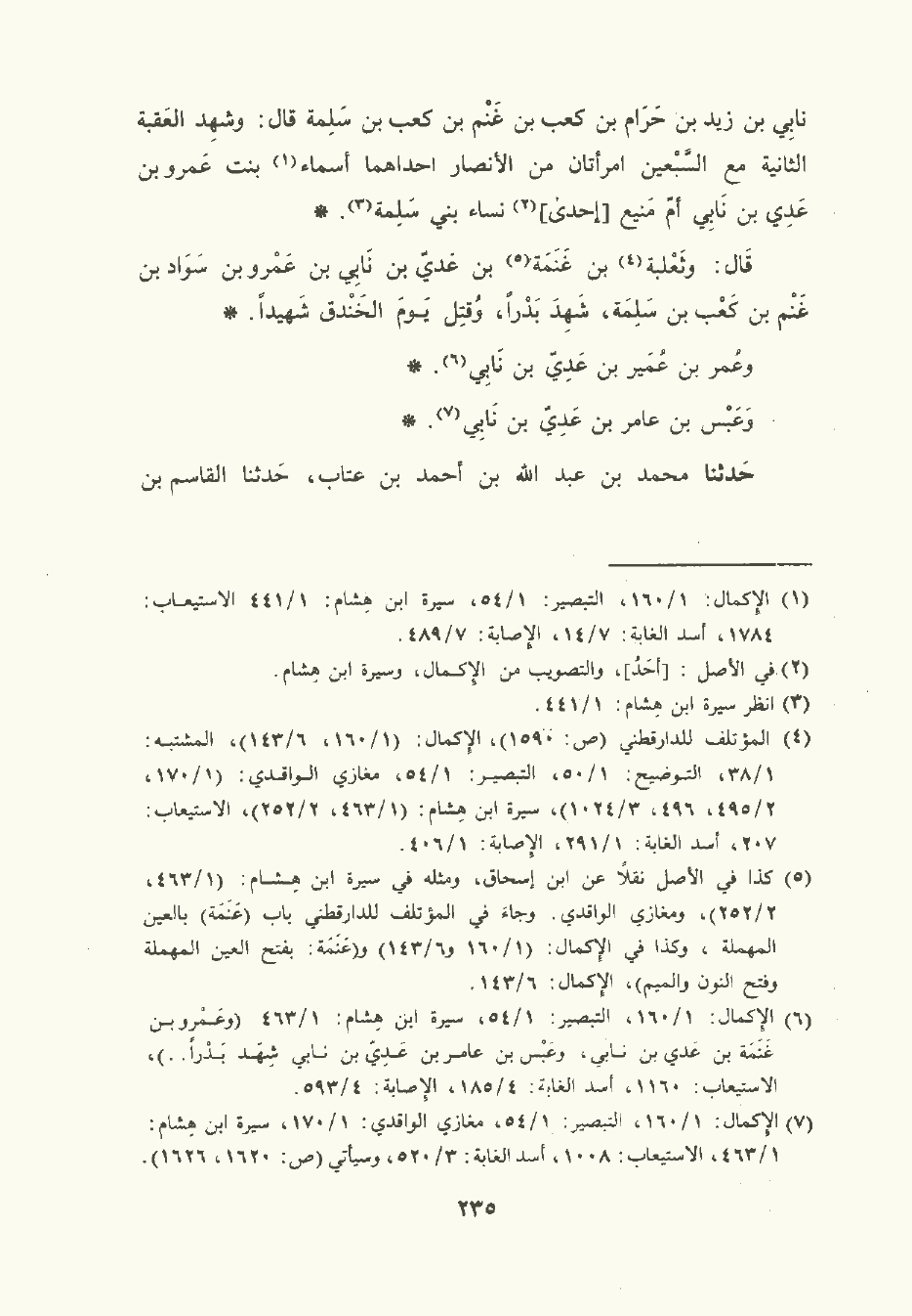 حَدَّثَنا مُحمَّد بن عَبد الله بن أحمد بن عَتَّاب , حَدَّثَنا القَاسِم بن المُغِيرَة , حَدَّثَنا ابن أبي أُوَيْس رَوَى إسماعيل بن إبراهيم , عن عمه موسى بن عُقْبَة , عن ابن شِهَاب فيمن شهد العَقَبة: