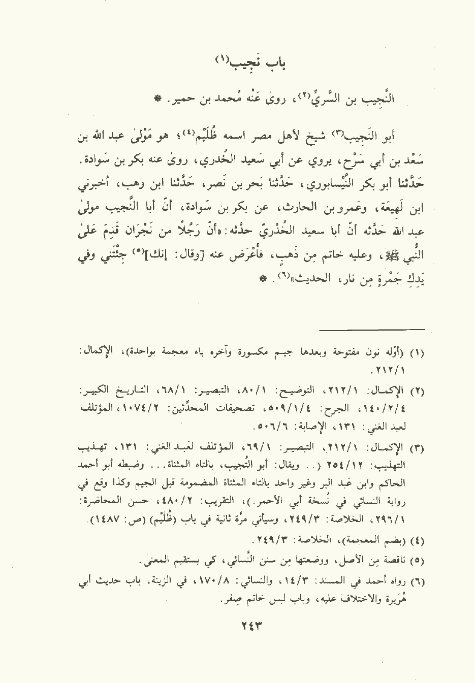 أبو النَّجِيب شيخ لأهل مِصْر اسمه ظليم هو مولى عَبد الله بن سَعْد بن أبي سرح يَرْوِي عَن أبي سَعِيد الخُدْري، رَوَى عنه بَكْر بن سَوَادة , حَدَّثَنا أبو بَكْر النَّيْسَابوري , حَدَّثَنا بحر بن نَصر , حَدَّثَنا ابن وَهْب , أَخْبَرني ابن لَهِيعَة وعمرو بن الحارث , عن بَكْر بن سَوادة أن أبا النَّجِيب مولى عبد الله حدثه أن أبا سَعِيد الخُدْري حدثه: أن رجلا من نَجْرَان قدم على النَّبِيّ صلى الله عليه وسلم وعليه خاتم من ذهب فأعرض عنه وقال: إنك جئتني وفي يدك جمرة من نار الحديث.