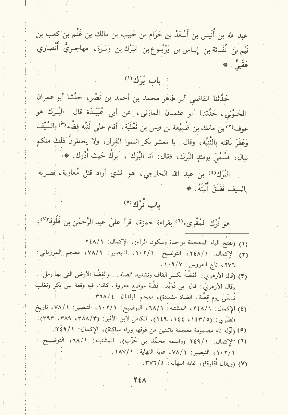 حَدَّثَنا القاضي أبو طاهر مُحمَّد بن أحمد بن نَصْر , حَدَّثَنا أبو عِمْران الجَوْني , حَدَّثَنا أبو عُثْمان المَازِني , عَن أبي عُبَيْدة قال: البرك هو عَوْف بن مالك بن ضُبَيْعَة بن قَيْس بن ثَعْلَبة أقام على ثَنِيَّة قضة بالسيف وعقر ناقته بالثنية، وقال: يا معشر بَكْر انسوا الفِرار ولا يخطرنَّ ذلك منكم ببال فَسُمِّيَ يومئذٍ البُرَك فقال: أنا البرك أبركُ حيث أُدْرك.