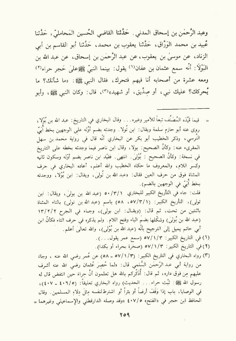 وعبد الرَّحْمن بن إسحاق المدني. حَدَّثَنا القاضي الحُسَين المَحَامِلي , حَدَّثَنا عبيد بن مُحمَّد الوَرَّاق , حَدَّثَنا يَعْقُوب بن مُحمَّد , حَدَّثَنا أبو القَاسِم بن أبي الزَّنَاد , عن موسى بن يَعْقُوب , عن عَبد الرَّحْمن بن إسحاق , عن عَبد الله بن البَوْلاَ: أنه سمع عُثْمان بن عَفَّان يقول: بينما النَّبِيّ صلى الله عليه وسلم على حجر حراء ومعه عشرة من أصحابه أنا فيهم فتحرك فقال النَّبِيّ صلى الله عليه وسلم: ما شأنك؟ ما يُحركك؟ عليك نبي أو صِدِّيق أو شهيد.