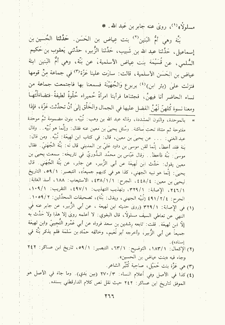 بَنَّة وهي أم البنين بنت عياض بن الحسن. حَدَّثَنا الحُسَين بن إسماعيل , حَدَّثَنا عَبد الله بن شَبِيب , حَدَّثَنا الزُّبَيْر حَدَّثني يَعْقُوب بن حكيم السلمي , عن قُسَيْمة بنت عِيَاض الأَسْلَمية , عن بَنَّة وهي أم البنين ابنة عِيَاض بن الحسن الأَسْلَمية قالت: سارت علينا عزة في جماعة من قومها فنزلت على بئر ابن يَرْبُوع والجُهَيْنة فسمعنا بها فاجتمعت جماعة من نساء الحاضر أنا فيهن فجئناها فرأينا امرأة حميراء حلوة لطيفة. فتضاءلتها ومعنا نسوة كلهن لهن الفضل عليها في الجمال والخلق إلى أن تحدثت عزة فإذا هي أبرع الخلق وأحلاه حديثا فما فراقناها إلا ولها الفضل علينا في أعيننا وما نرى أن امرأة تفوقها جمالا وحسنا وحلاوة.