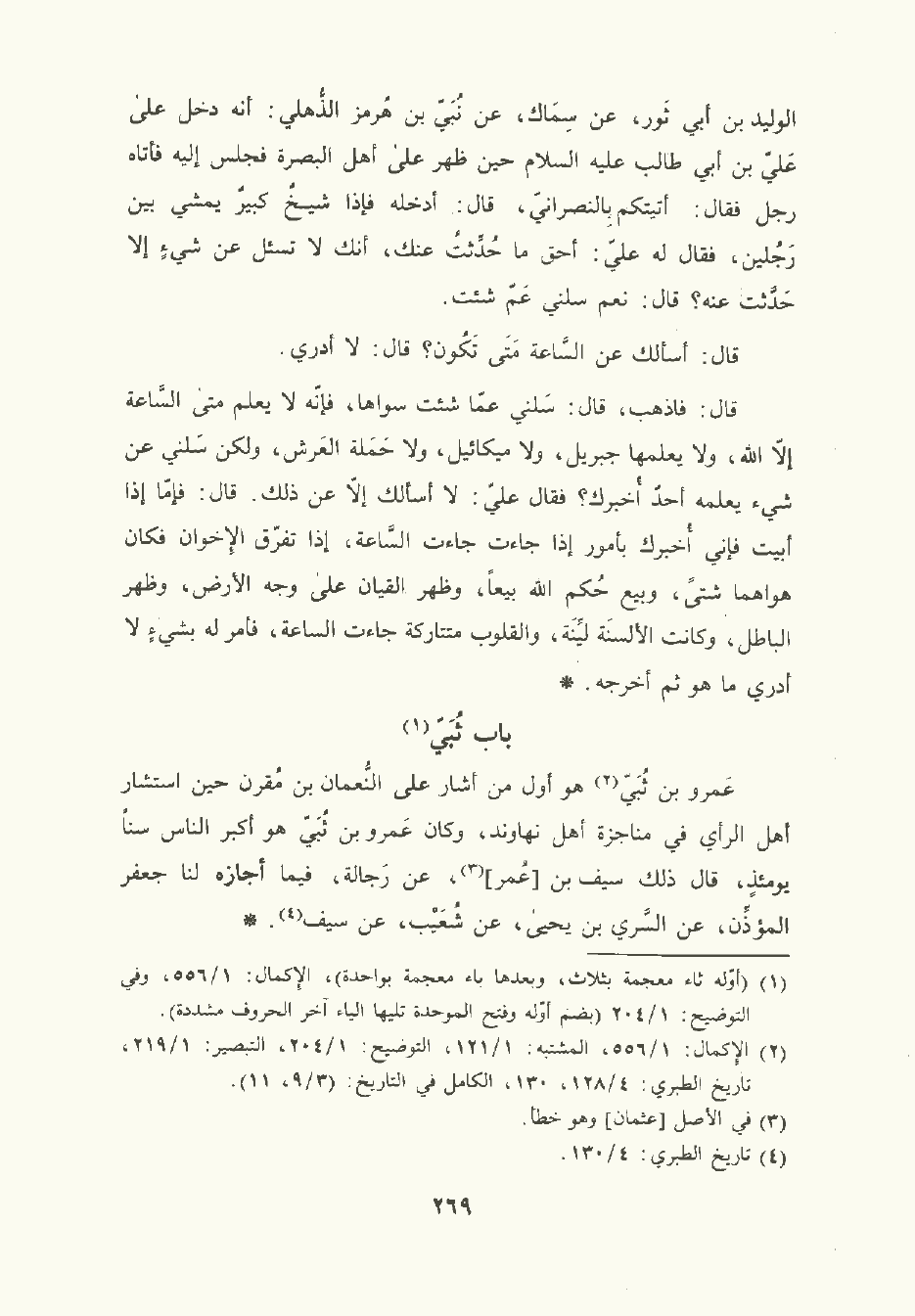 حَدَّثَنا الوليد بن أبي ثور , عن سماك عن نُبَي بن هرمز الذهلي أنه دخل على علي بن أبي طالب عليه السَّلام حين ظهر على أهل البصرة فجلس إليه فأتاه رجل فقال: أتيتكم بالنصراني قال: أدخله فإذا شيخ كبير يمشي بين رجلين، فقال له علي: أحق ما حدثت عنك. أنك لا تسئل عن شيء إلا حدثت عنه؟ قال: نعم سلني عم شئت.