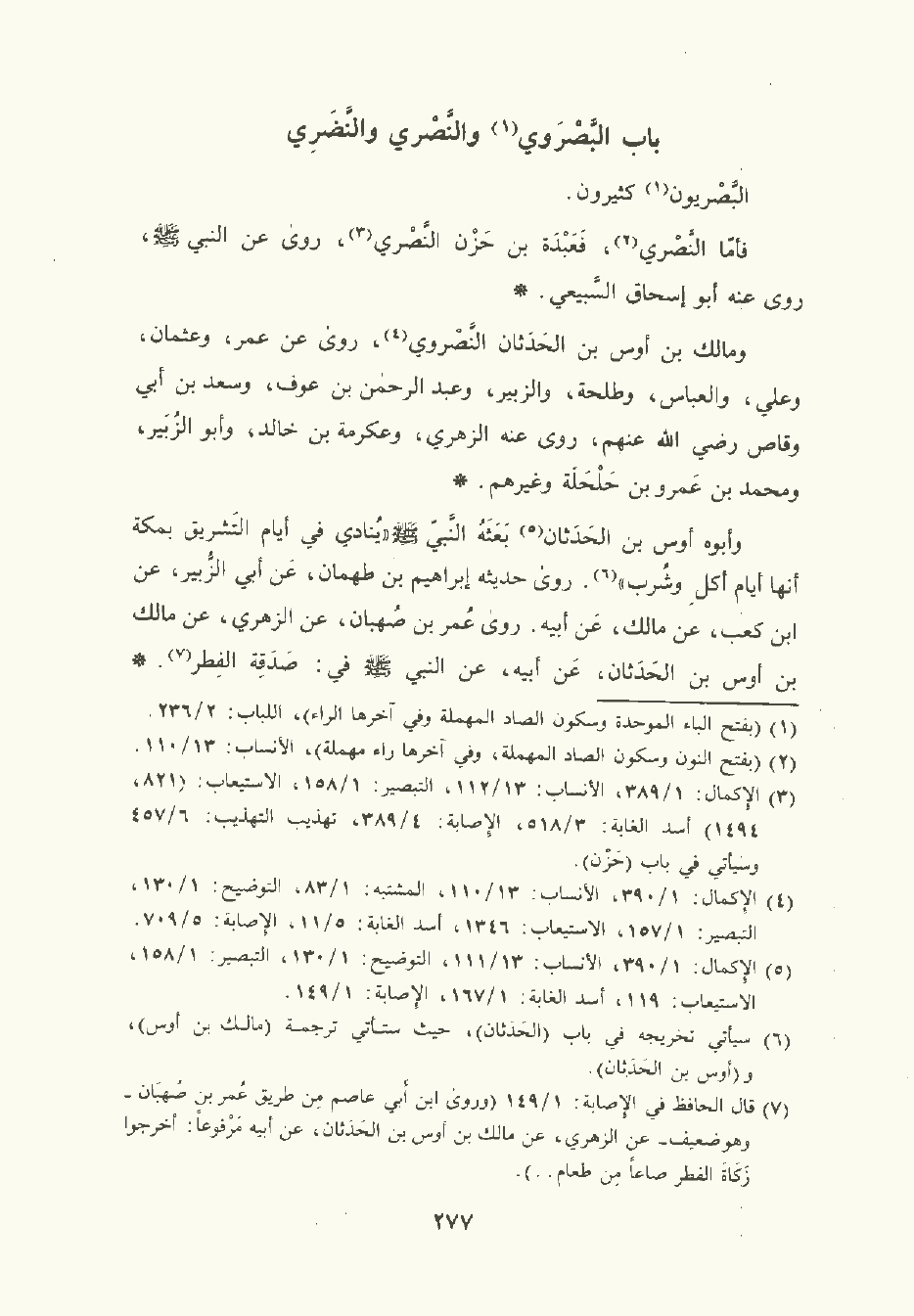 ومالك بن أوس بن الحَدَثان النَّصْرَوي رَوَى عن عُمَر وعُثمان وعَليّ والعباس وطَلْحَة والزُّبَيْر وعبد الرَّحْمن بن عَوْف وسَعْد بن أبي وَقَّاص رضي الله عنهم، رَوَى عنه الزُّهْري وعكرمة بن خالد وأبو الزُّبَيْر ومحمد بن عَمْرو بن حَلْحَلة وغيرهم.