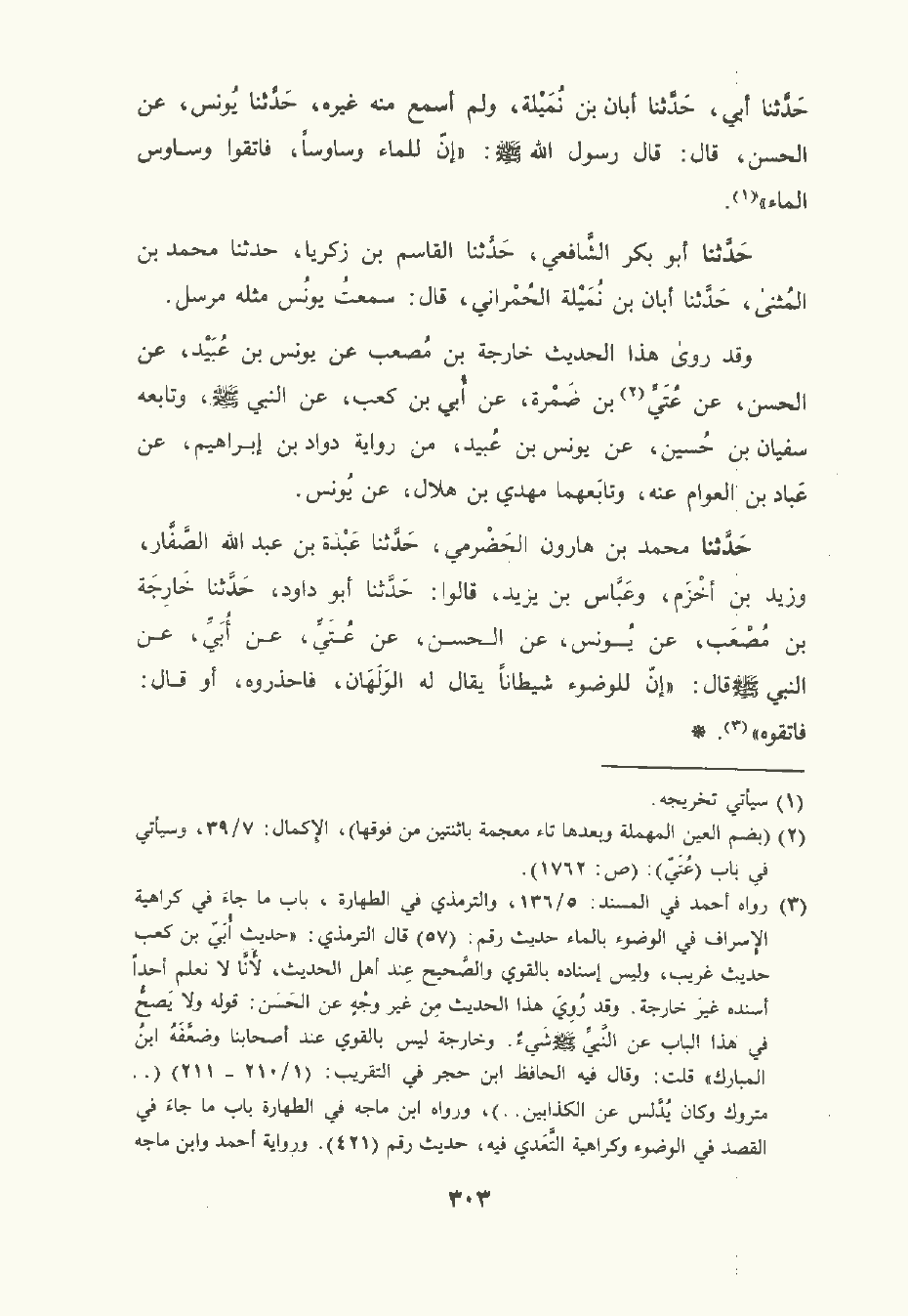 حَدَّثَنا مُحمَّد بن هارون الحَضْرميّ , حَدَّثَنا عَبْدة بن عبد الله الصَّفَّار وزَيْد بن أَخْزَم وعَبَّاس بن يَزِيد قالوا: حَدَّثَنا أبو داود , حَدَّثَنا خارجة بن مُصْعَب , عن يُونُس , عن الحسن , عن عُتَيِّ , عَن أبي , عن النَّبِيّ صلى الله عليه وسلم قال: إن للوضوء شيطان يقال له الوَلَهَان فاحذروه أو قال: فاتقوه.