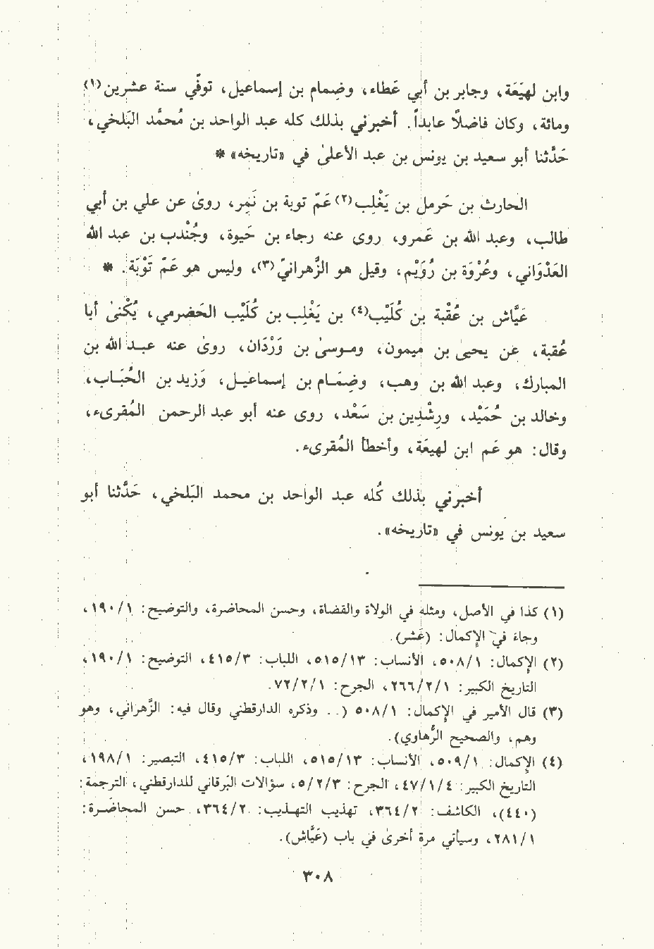 الحارث بن حَرْمل بن يَغْلِب عَمّ تَوْبَة بن نَمِر رَوَى عن علي بن أبي طالب وعَبد الله بن عَمْرو، رَوَى عنه رَجَاء بن حَيْوة وجُنْدب بن عبد الله العَدْوَاني وعُرْوة بن رُوَيْم وقيل هو الزَّهْرَاني وليس هو عَمّ تَوْبَة.