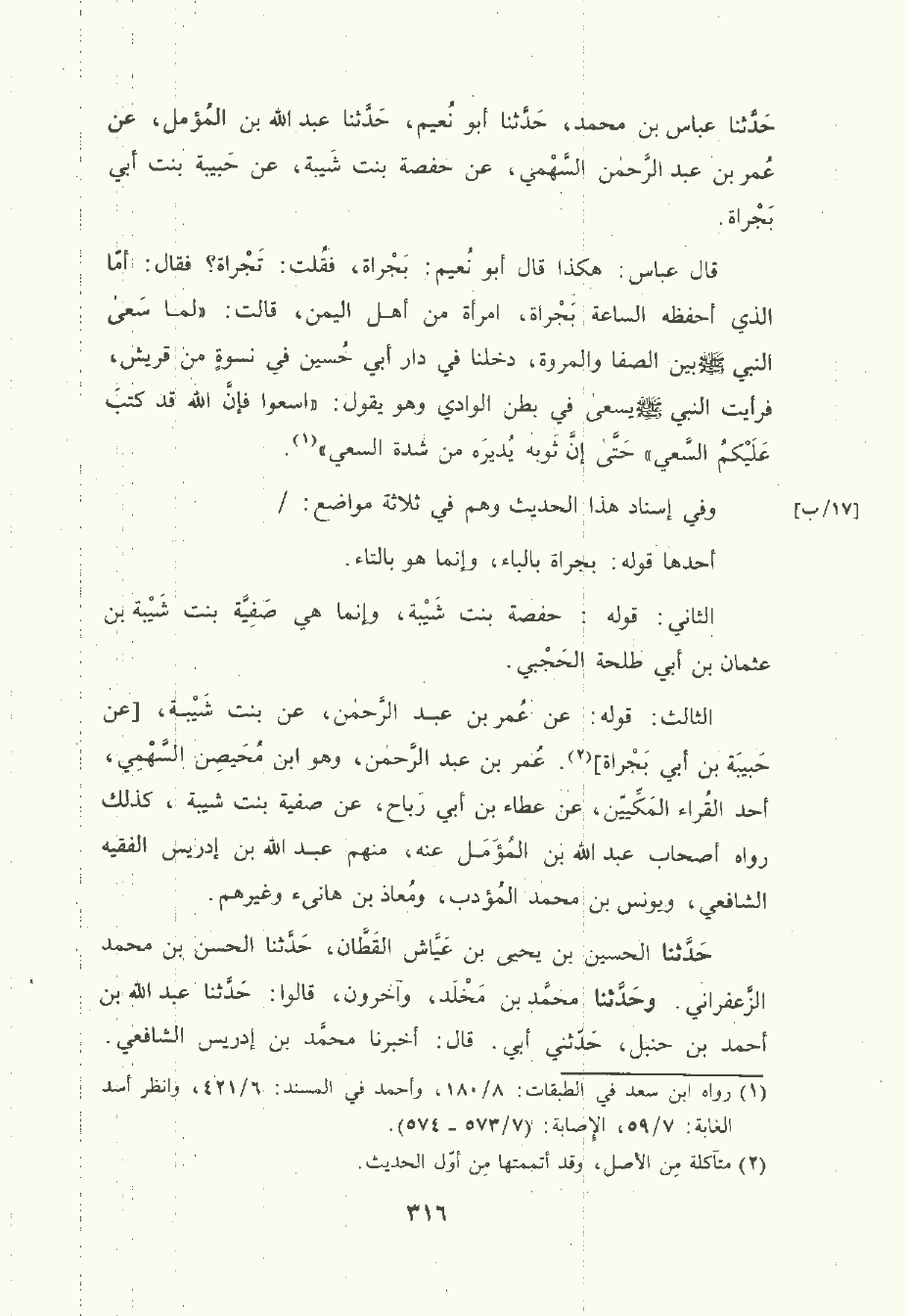 قال عَبَّاس: هكذا قال أبو نُعَيْم: بَجْرَاة فقلت: تَجْرَاة؟ فقال: أما الَّذي أحفظه الساعة بَجْرَاة، امرأة من أهل اليمن قالت: لما سعى النَّبِيّ صلى الله عليه وسلم بين الصفا والمروة دخلنا في دار أبي حُسَين في نسوة من قُرَيْش فرأيت النَّبِيّ صلى الله عليه وسلم يسعى في بطن الوادي وهو يقول: اسعوا فإن الله قد كتب عليكم السعي حتى إن ثوبه يديره من شدة السعي.