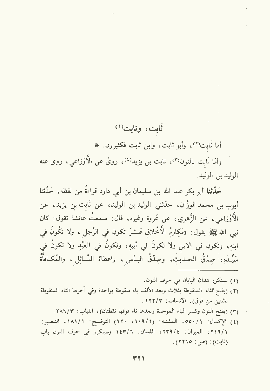 وأمَّا نَابِت بالنون نَابِت بن يَزِيد رَوَى عن الأَوْزَاعي، رَوَى عنه الوليد بن الوليد.