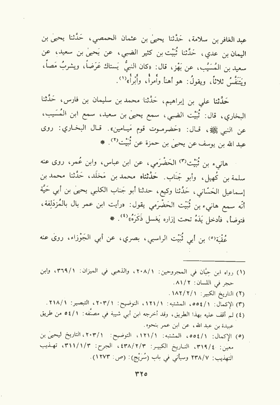 حَدَّثَنا علي بن إبراهيم , حَدَّثَنا مُحمَّد بن سُلَيمان بن فارس , حَدَّثَنا البُخَاري قال: ثُبَيت الضَّبِيّ سمع يَحْيى بن سَعِيد سمع ابن المسيب , عن النَّبِيّ صلى الله عليه وسلم قال: حضرموت قوم ميامين. قال البُخَاري: رَوَى عَبد الله بن يُوسُف , عن يَحْيى بن حَمْزة , عن ثُبَيْت.