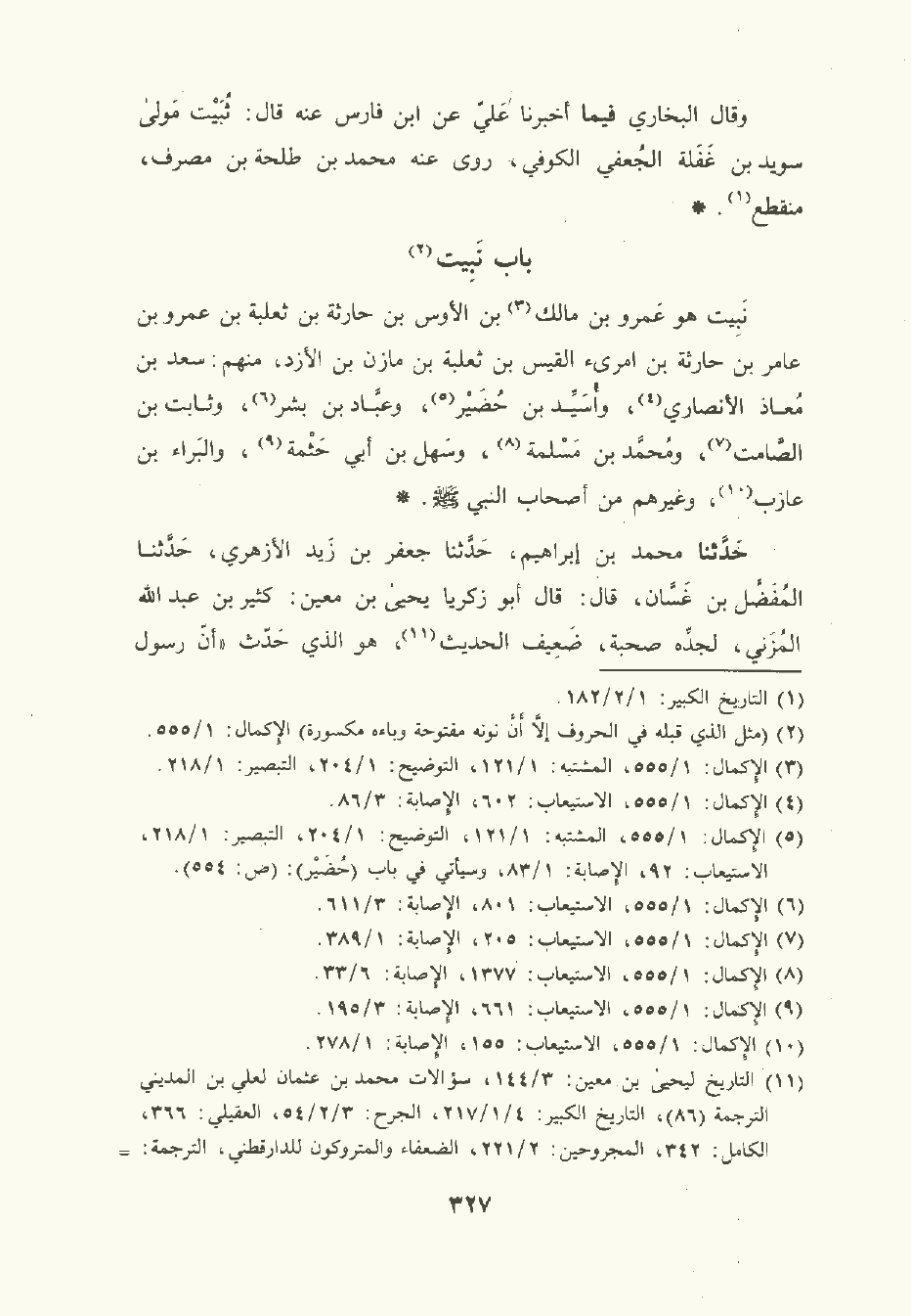 حَدَّثَنا مُحمَّد بن إبراهيم , حَدَّثَنا جَعْفَر بن زَيْد الأزهري , حَدَّثَنا المُفَضَّل بن غَسَّان قال: قال أبو زكريا يَحْيى بن مَعِين: كثير بن عبد الله المزني لجده صُحْبَة ضعيف الحديث هو الَّذي حدث أن رسول الله صلى الله عليه وسلم جعل عقل الأَنْصَاري على الأَنْصَار والنَّبِيت والخزرج وعدد القبائل.