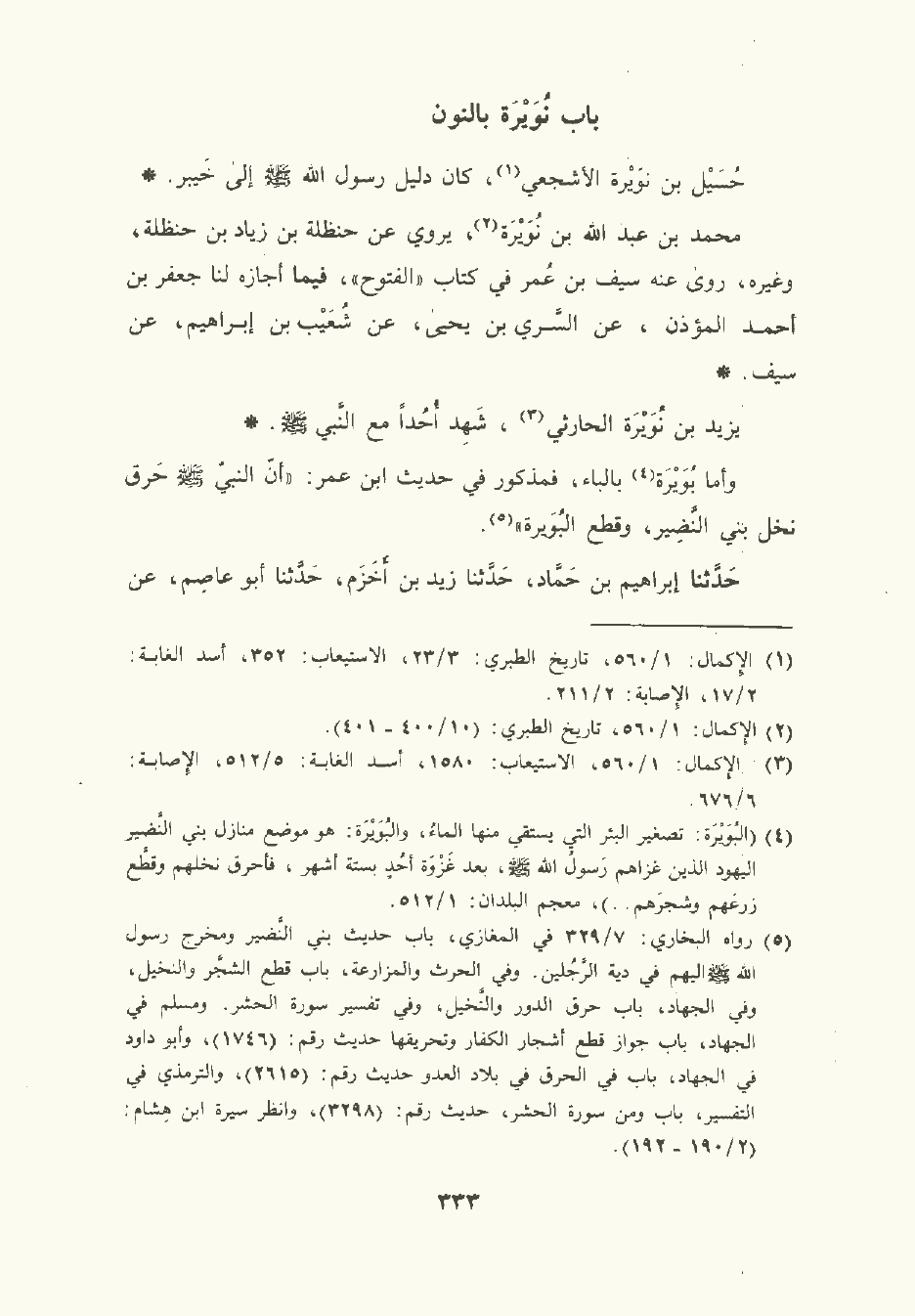 حَدَّثَنا إبراهيم بن حَمَّاد , حَدَّثَنا زَيْد بن أخزم , حَدَّثَنا أبو عَاصِم , عن ابن جريج وسُفْيان , عن موسى بن عُقْبَة , عن نافع , عن ابن عُمَر: أن رسول الله صلى الله عليه وسلم قطع نخل بني النضير وحرق، وفي حديث أحدهما.