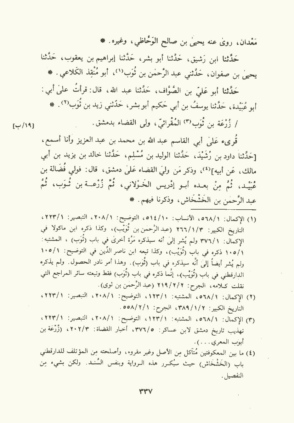 قُريءَ على أبي القَاسِم عَبد الله بن مُحمَّد بن عبد العزيز وأنا أسمع , حَدَّثَنا داود بن رشيد , حَدَّثَنا الوليد بن مُسْلم , حَدَّثَنا خالد بن يَزِيد بن أبي مالك , عَن أبيه وذكر من ولي القضاء على دمشق قال: فولي فضالة بن عُبَيْد ثم من بعده أبو إدريس الخَوْلانيّ ثم زُرْعَة بن ثوب ثم عبد الرَّحْمن بن الخشخاش وذكرنا فيهم.