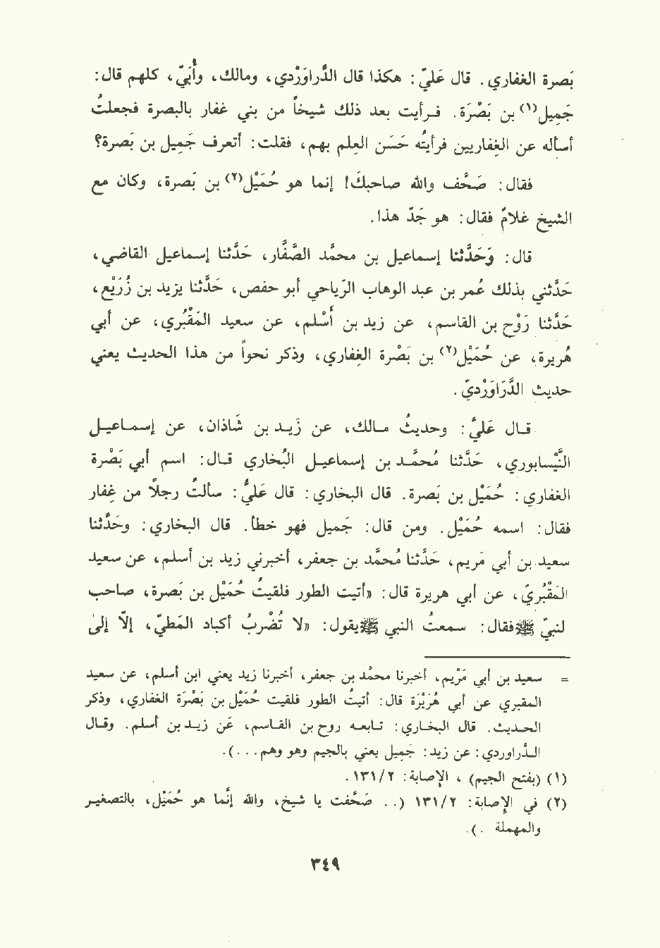 قال علي: وحديث مالك , عن زَيْد بن شَاذان , عن إسماعيل النَّيْسَابوري , حَدَّثَنا مُحمَّد بن إسماعيل البُخَاري قال: اسم أبي بَصْرَة الغِفَاري: حُمَيل بن بَصْرة. قال البُخَاري: قال علي: سألت رجلا من غفار فقال: اسمه حُمَيْل. ومن قال: جَمِيل فهو خطأ. قال البُخَاري: وحدثنا سَعِيد بن أبي مَرْيم , حَدَّثَنا مُحمَّد بن جَعْفَر , أَخْبَرني زَيْد بن أَسْلم , عن سَعِيد المَقْبُري , عَن أبي هُرَيْرة قال: أتيت الطُّور فلقيت حُمَيْل بن بَصْرَة صاحب النَّبِيّ صلى الله عليه وسلم فقال: سَمِعتُ النَّبِيّ صلى الله عليه وسلم يقول: لا تُضْرب أكباد المَطِيّ إلا إلى المسجد الحرام ومسجدي ومسجد إيلياء قال البُخَاري: قال لي علي: سألت رجلا من ولده؟ فقال: هو حُمَيْل. قال: وتابعه رَوْح بن القَاسِم , عن زيد.