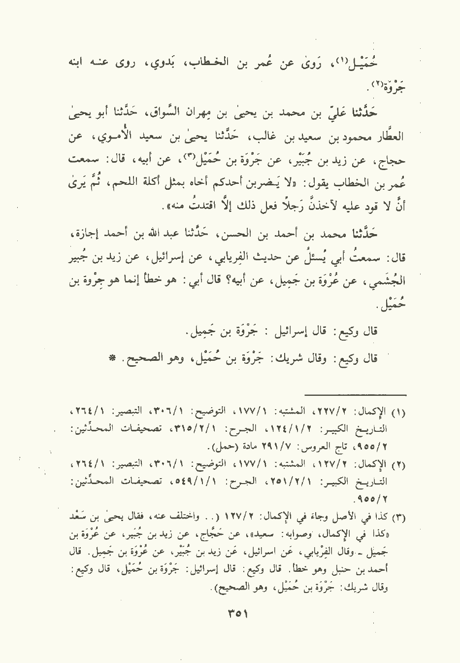 حَدَّثَنا مُحمَّد بن أحمد بن الحسن , حَدَّثَنا عَبد الله بن أحمد إجازة، قال: سَمعتُ أبي يسئل عن حديث الفِرْيَابي , عن إسرائيل , عن زَيْد بن جُبَيْر الجُشَمِيّ , عن عُرْوة بن جَمِيل , عَن أبيه؟ قال أبي: هو خطأ إنما هو جِرْوَة بن حُمَيْل.