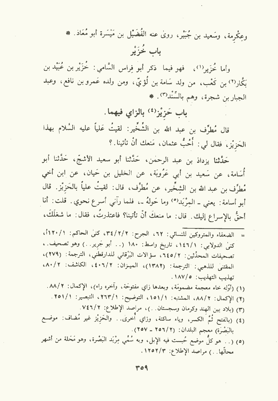 حَدَّثَنا يَزْدَاد بن عبد الرَّحْمن , حَدَّثَنا أبو سَعِيد الأشج , حَدَّثَنا أبو أسامة , عن سَعِيد بن أبي عَرُوبَة , عن الخليل بن حَيان , عن ابن أخي مُطَرِّف بن عَبد الله بن الشِّخِّير , عن مُطَرِّف قال: لقيت عليا بالحَزِيز. قال أبو أسامة: يعني – المربد وما حوله – فلما رآني أسرع نحوي. قلت: أنا أحق بالإسراع إليك. قال: ما منعك أن تأتينا؟ فاعتذرت، فقال: ما شغلك وما منعك إلا حب عُثْمان. قال: قلما تنفس عنه أصحابه. قال: إن تحبه فقد والله كان خيرنا وأبرنا وأوصلنا.