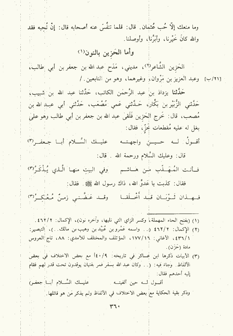 حَدَّثَنا يَزْدَاد بن عبد الرَّحْمن الكاتب , حَدَّثَنا عَبد الله بن شبيب حَدَّثني الزُّبَيْر بن بَكَّار حَدَّثني عمي مُصْعَب حَدَّثني أبي عَبد الله بن مُصْعَب قال: خرج الحزين فلقى عَبد الله بن جَعْفَر بن أبي طالب وهو على بغل له عليه مقطعات خَزٍّ، فقال: