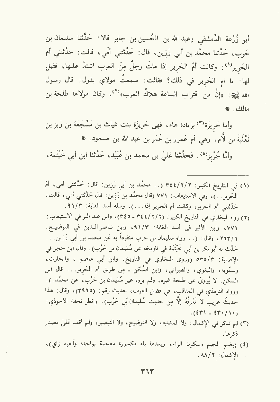 حَدَّثَنا أبو زُرْعَة الدِّمَشْقي وعَبد الله بن الحُسَين بن جابر قالا: حَدَّثَنا سُلَيمان بن حَرْب , حَدَّثَنا مُحمَّد بن أبي رَزِين قال: حدثتني أمي قالت: حدثتني أم الحَرِير: وكانت أم الحَرِير إذا مات رجل من العرب اشتد عليها فقيل لها: يا أم الحرير في ذلك؟ فقالت: سَمِعتُ مولاي يقول: قال رسول الله صلى الله عليه وسلم: إن من اقتراب الساعة هلال العرب وكان مولاها طَلْحة بن مالك.