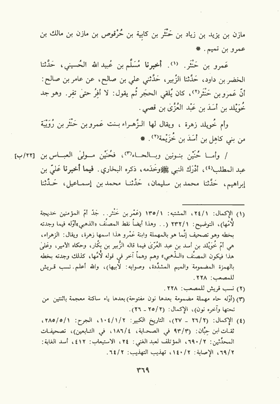 وأمَّا حُنَيْن بنونين وبالحاء فحنين مولى العَبَّاس بن عبد المطلب أدرك النَّبِيّ صلى الله عليه وسلم وخدمه ذكره البُخَاري. فيما أخبرنا علي بن إبراهيم , حَدَّثَنا مُحمَّد بن سُلَيمان , حَدَّثَنا مُحمَّد بن إسماعيل , حَدَّثَنا عَبد الله بن يُوسُف , عَن أبي حُنَيْن بن عَبد الله بن حُنَيْن المديني أخي إبراهيم بن عبد الله , عن بنت أخيه , عن خالها يقال له ابن الشَّاعر: أن حنينا جده كان غلاما للنبي صلى الله عليه وسلم وكان حنين يخدم النَّبِيّ صلى الله عليه وسلم ثم وهبه بعد لعمه العَبَّاس فأعتقه.