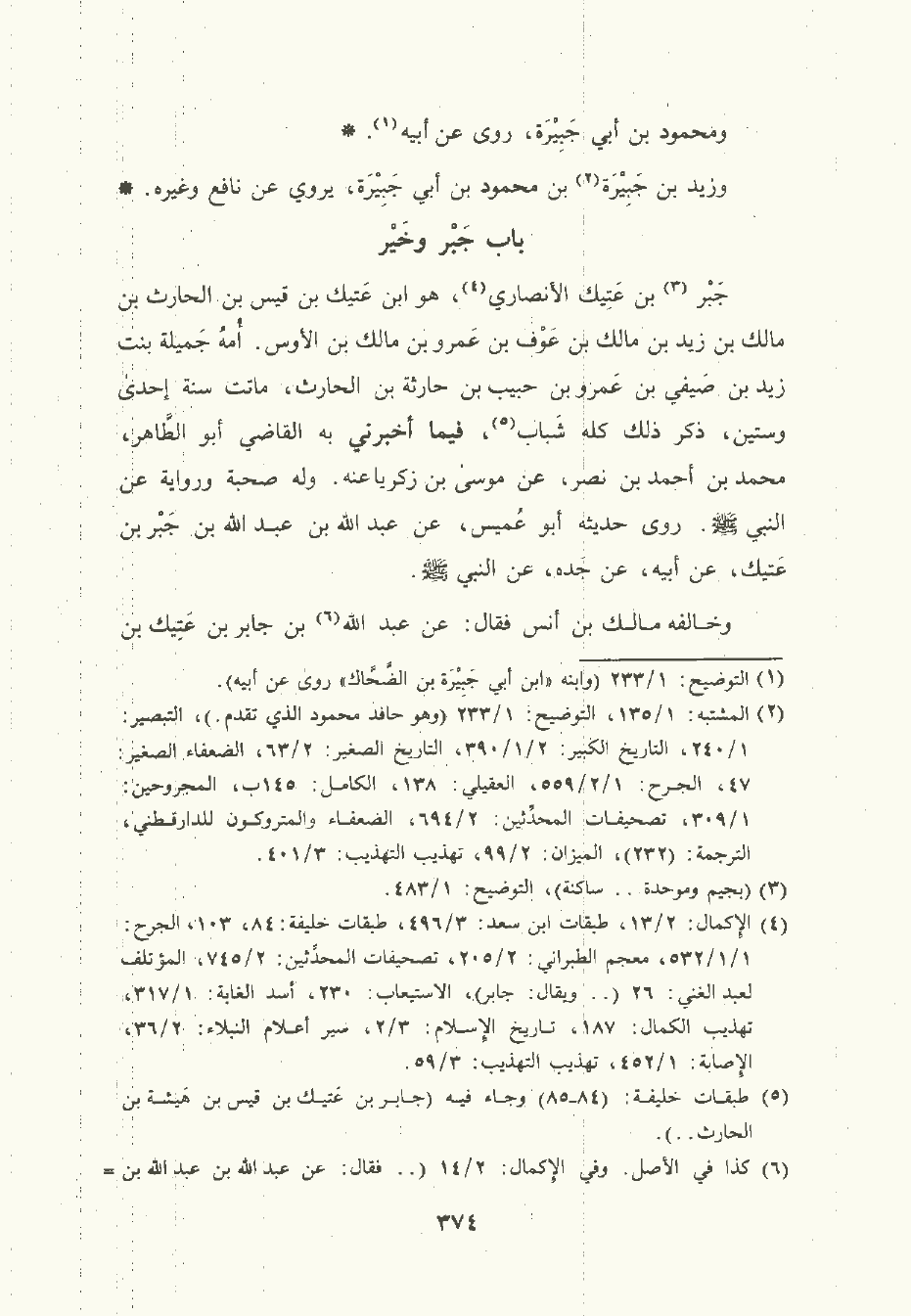 جَبْر بن عَتِيك الأَنْصَاري هو ابن عَتِيك بن قَيْس بن الحارث بن مالك بن زَيْد بن مالك بن عَوْف بن عَمْرو بن مالك بن الأوس. أمه جَميلة بنت زَيْد بن صيفي بن عَمْرو بن حبيب بن حارثة بن الحارث ماتت سنة إحدى وستين ذكر ذلك كله شباب فيما أَخْبَرني به القاضي أبو الطاهر مُحمَّد بن أحمد بن نصر , عن موسى بن زكريا عنه. وله صُحْبَة ورواية عن النَّبِيّ صلى الله عليه وسلم. رَوَى حديثه أبو عُمَيْس , عن عَبد الله بن عَبد الله بن جبر بن عَتِيك , عَن أبيه , عن جده , عن النَّبِيّ صلى الله عليه وسلم.