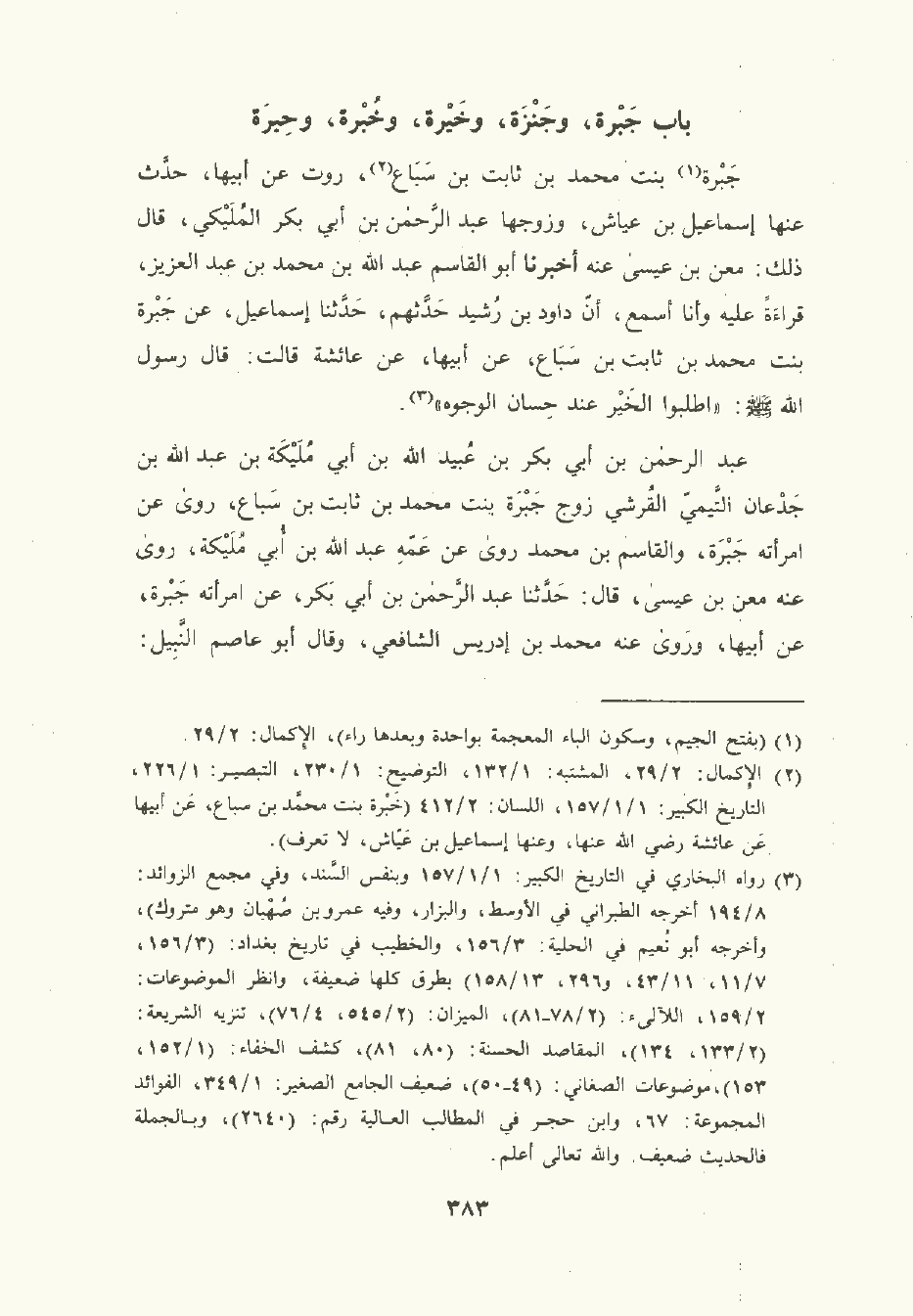 جَبْرَة بنت مُحمَّد بن ثابت بن سَبَاع روت عَن أبيها حدث عنها إسماعيل بن عَيَّاش وزوجها عبد الرَّحْمن بن أبي بَكْر المُلَيْكي قال ذلك: معن بن عيسى عنه أخبرنا أبو القَاسِم عَبد الله بن مُحمَّد بن عبد العزيز قراءة عليه وأنا أسمع أن داود بن رشيد حدثهم , حَدَّثَنا إسماعيل , عن جبرة بنت مُحمَّد بن ثابت بن سَبَاع , عَن أبيها , عن عائشة قالت: قال رسول الله صلى الله عليه وسلم: اطلبوا الخير عند حسان الوجوه.