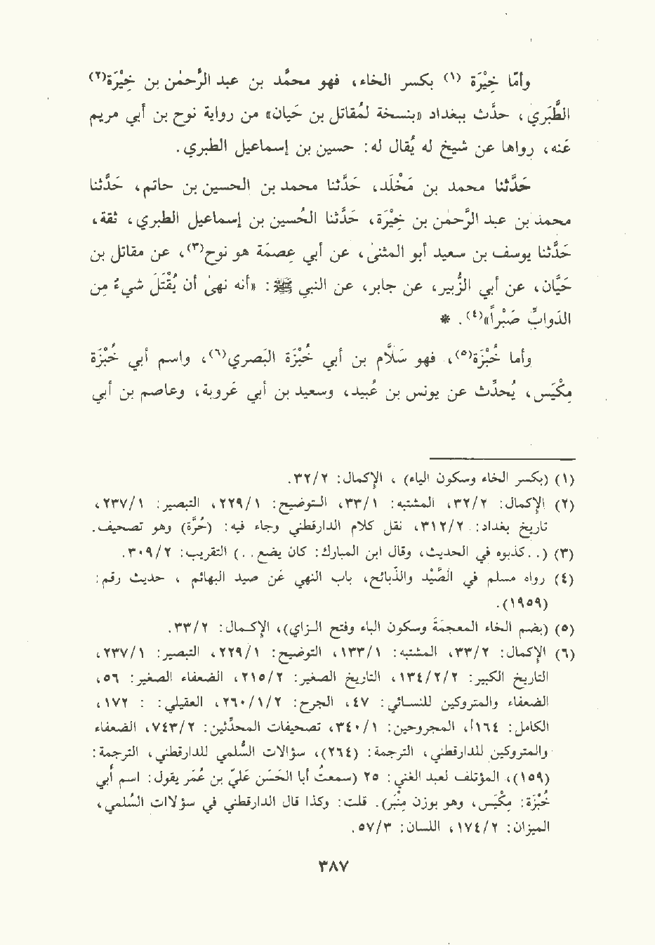 وأمَّا خِيرَة بكسر الخاء فهو مُحمَّد بن عبد الرَّحْمن بن خِيرَة الطَّبَري حدث ببغداد بنسخة لمُقَاتِل بن حَيان من رواية نوح بن أبي مَرْيم عنه رواها عن شيخ له يقال له حُسَين بن إسماعيل الطَّبَري.